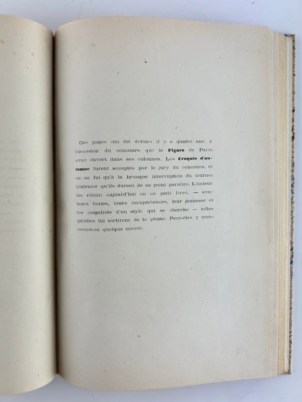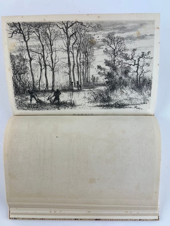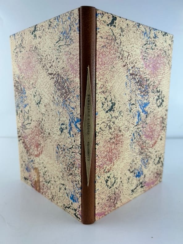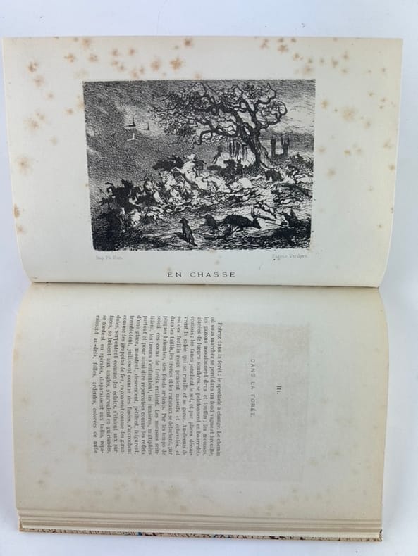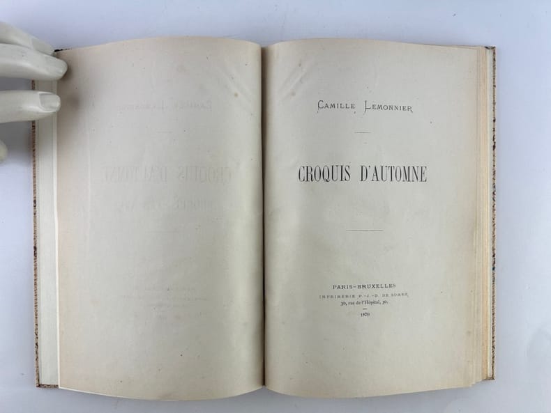 Paris-Bruxelles Imprimerie P.J.D. de Somer 1870, in-8 (14,5x21,5cm), reliure à la Bradel, 102p. Edition originale. Une des premières publications de l'auteur. Ouvrage orné de deux gravures en noir par Eugène Verdyen. (Chasse & Marais ). Elégante reliure contemporaine à la Bradel de Patrick Loutrel. Dos long de chagrin fauve orné d'une pièce de titre en cuir retourné, plats recouvert de papier de création. Couvertures non conservées. Rousseurs sur les gravures.