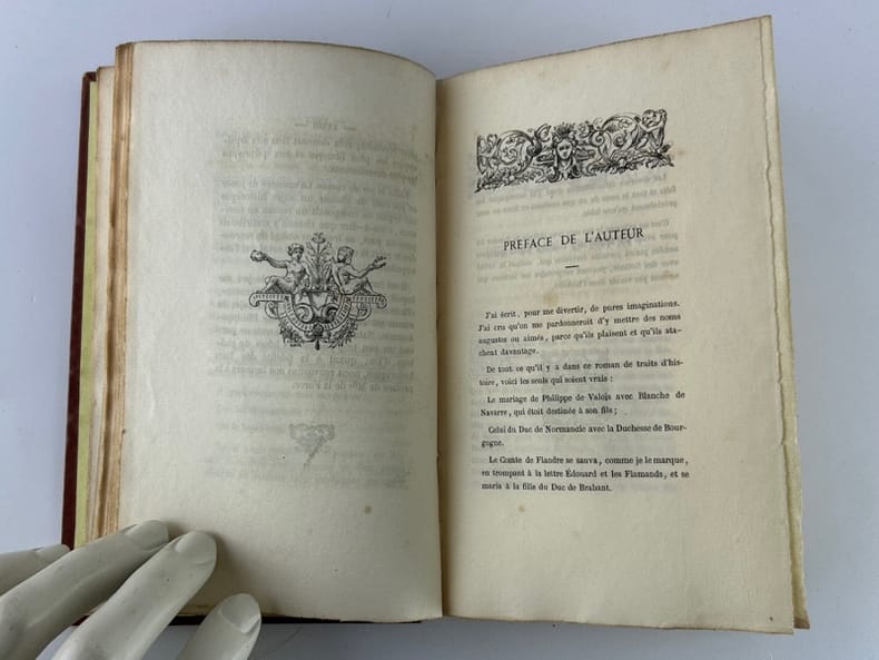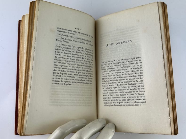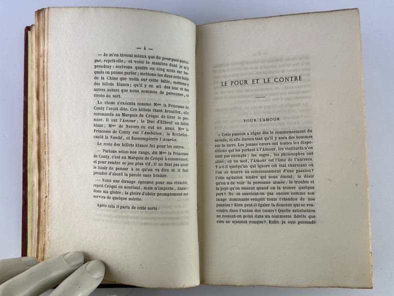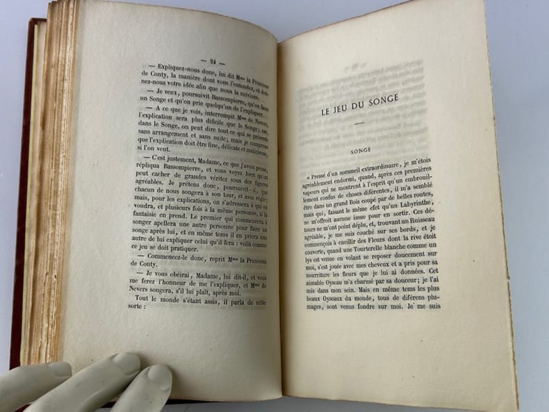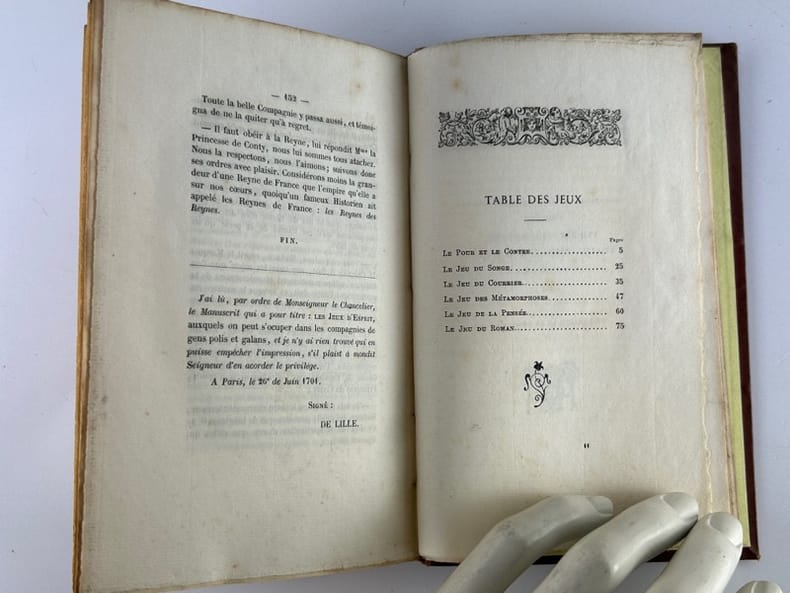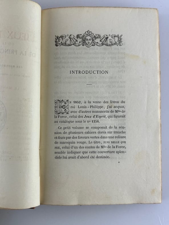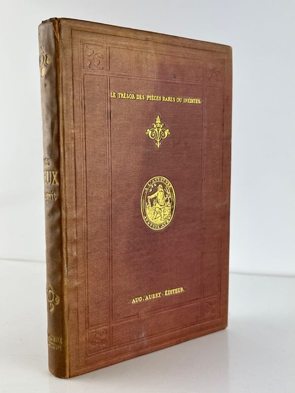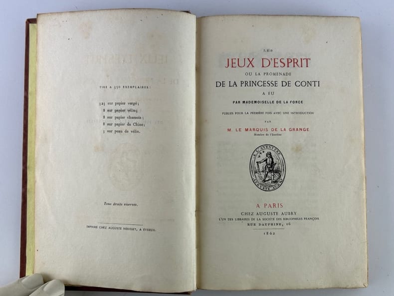 Paris Chez Auguste Aubry, L'un des libraires de la Société des Bibliophiles François. Les trésors des pièces rares et indédites 1862, 11,5 x 16,5 cm, plein bradel toilé éditeur, 152p. Edition originale, tirée à 350 ex. Un des 323 ex. sur vergé, non numéroté. Toile éclaircie, intérieur bon. Écrite en 1701, cette fiction met en scène des personnalités de la régence de Marie de Médicis et du début du règne de Louis XIII : la princesse de Conti, Bassompierre, le duc de Guise, la duchesse de Nevers... qui s'amusent avec des jeux d'esprit alors en vogue dans les salons : Le pour et le contre, Le jeu du songe, Le jeu du courrier, Le jeu des métamorphoses, Le jeu de la pensée et Le jeu du roman. Melle de La Force, célèbre pour ses aventures galantes et sa vie agitée, introduisit la féerie dans la haute société frivole, mais son oeuvre connue dans toute l'Europe, tomba dans l'oubli. Elle revient au goût du jour en 1862 lorsque M. de La Grange publia « Les jeux d'esprit » (source Michel Souloumiac « Mademoiselle de La Force, un auteur méconnu du XVII ème siècle »).