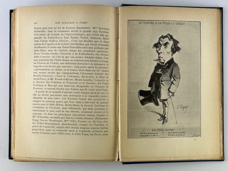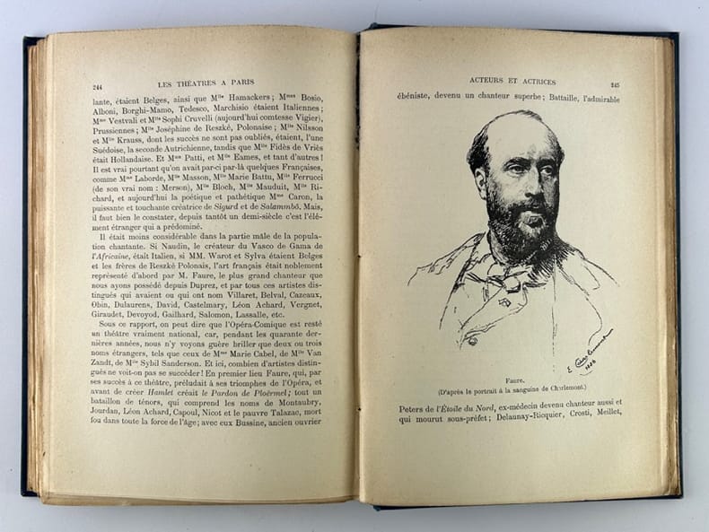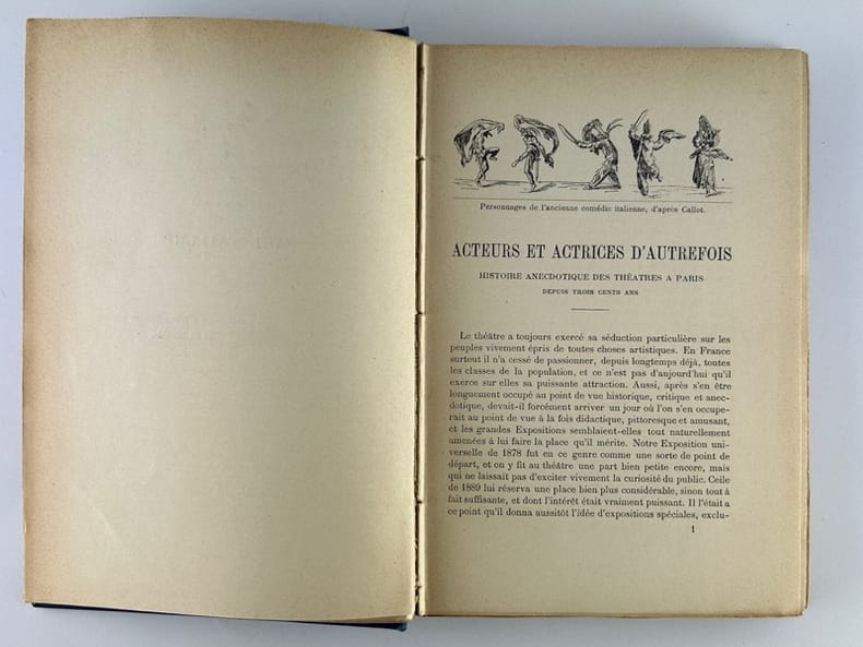 Félix Juven et Cie, Editeurs "Paris, 1896, in-8 carré, demi-veau vert à coins, dos rond très orné de fers dorés, tête dorée. Couvertures illustrées en couleurs conservées. Reliure de l'époque non signée. 4ff.-278pp.-1fbl. 109 illustrations et portraits in et hors-texte. Edition originale. Notre exemplaire est l'un des 15 sur papier du Japon, seul grand papier, ici relié à toutes marges. ""Il a été tiré 15 exemplaires sur papier du Japon numérotés, au prix de 10fr. l'exemplaire."" Bibliographie de la France, 1897, p.75. Le théâtre sous l'Ancien Régime / Les théâtres sous l Révolution et sous l'Empire / Les théâtres sous la Restauration et sous le gouvernement de Juillet / Le théâtre moderne. Très bel exemplaire dans son rare tirage de luxe. De raymond poisson à Sarah Bernhardt."