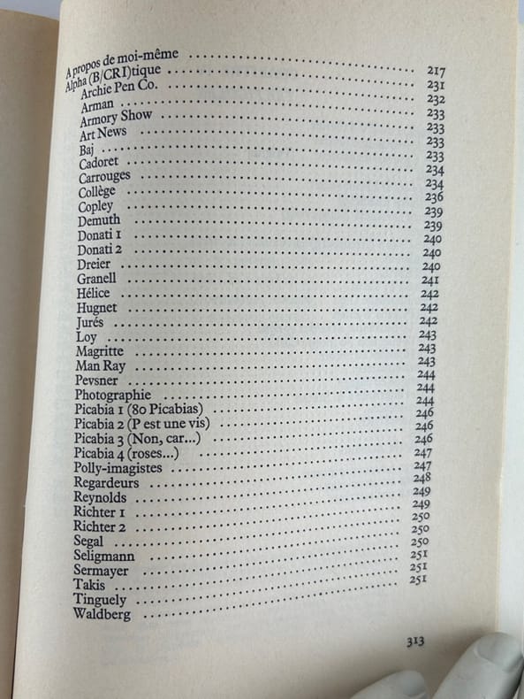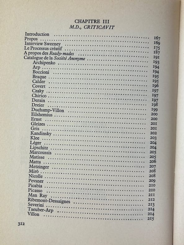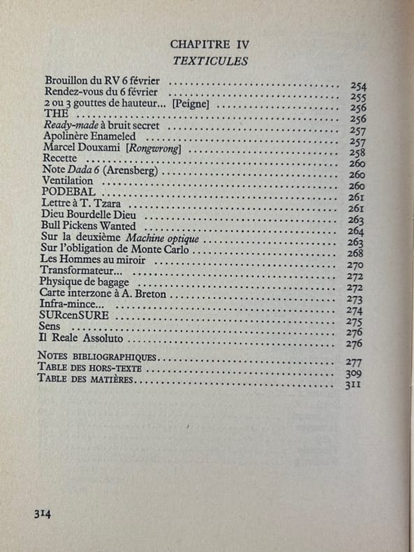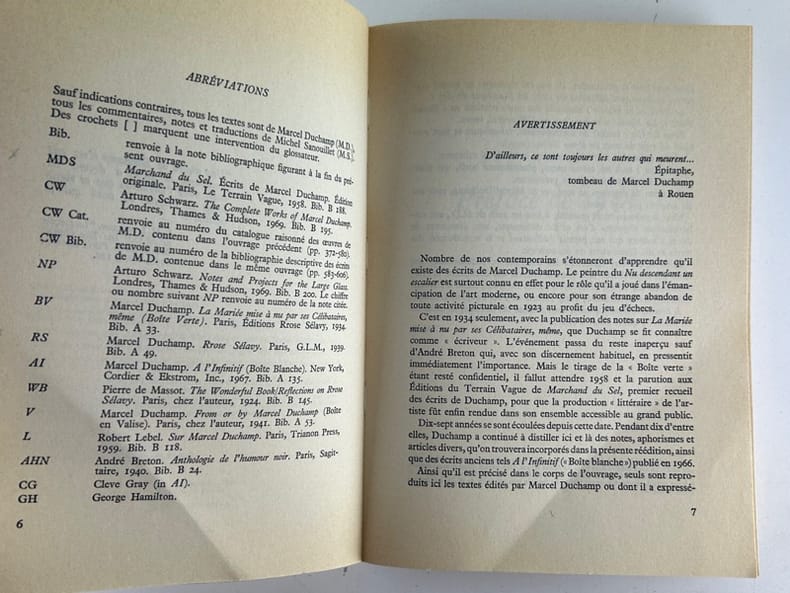 Textes réunis et présentés par Michel Sanouillet. Paris : Editions Flammarion, 1976. Nouvelle édition revue et augmentée. Un volume broché (15x21 cm), 314 pages et deux cahiers photographiques. Contient : Le voile de la mariée, Rrose & Cie, M.D. Criticavit, Texticules (notes, contrepèteries, calembours, critiques, articles, etc.). Bon état.