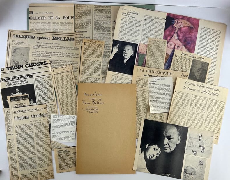 Paris, Denoël / Galerie André François Petit, 24 mars 1969, 21x21cm, cartonnage toilée éditeur orné d'un dessin en creux, sous rodhoïd, 96p. Edition originale. Parfait état. 103 reproductions en noir avec notices. Catalogue raisonné non exhaustif de l'oeuvre gravé de Bellmer. On joint un ensemble de coupures de presse des années 70'-80' & le tiré à part de la revue "Synthèses", avril 1954, 5p. par René Solier.