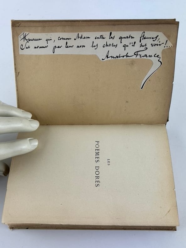 L'un des deux seuls recueils poétiques de l'auteur, adressé à son ami, Henry Roujon. Paris, Alphonse Lemerre, (15 janvier) 1873. 1 vol. (110 x 185 mm) de 1, [2] f., 146 p. et [1] f. Bradel demi-percaline beige, pièce de titre, fleuron, chiffre en pied (reliure signée de Paul Vié). Édition originale. Envoi signé : « à Henry Roujon, Anatole France ». Tirage à 580 exemplaires sur vélin. On joint : Jacques Roujon, La Vie et les Opinions d'Anatole France. Paris, Plon, 1925.