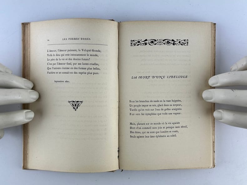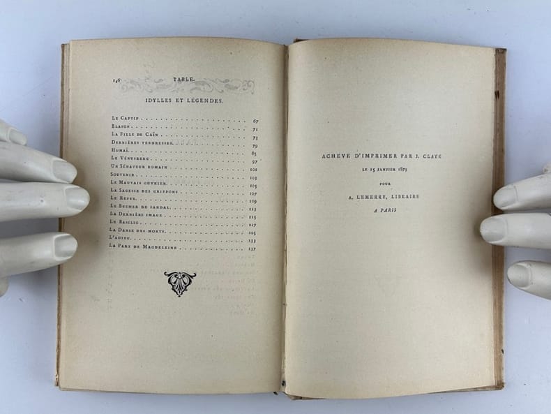 Paris Alphonse Lemerre/ Imp. J. Claye 15 janvier 1873,, in-12 (12x18,5cm), pleine toile à la Bradel, couvertures conservées, 146p. Édition originale du premier recueil d'Anatole France dédié à Leconte de Lisle. Vers autographe signé contrecollé au verso de la couverture. Reliés à la suite un feuillet manuscrit pointant les ajouts et les suppressions dans l'édition de 1896 chez Lemerre des Poésies d'Anatole France. Toujours à la suite les pages de la revue "L' Artiste" du 1er avril 1870 avec les version originales et les passages pointés des modifications apportées par l'auteur lors de la présente publication. Petit manque de toile en tête et dos insolé.