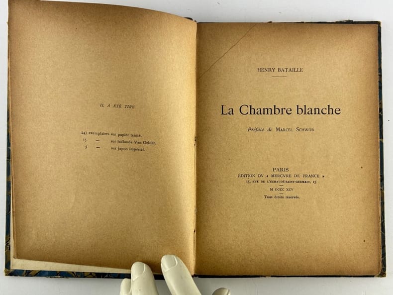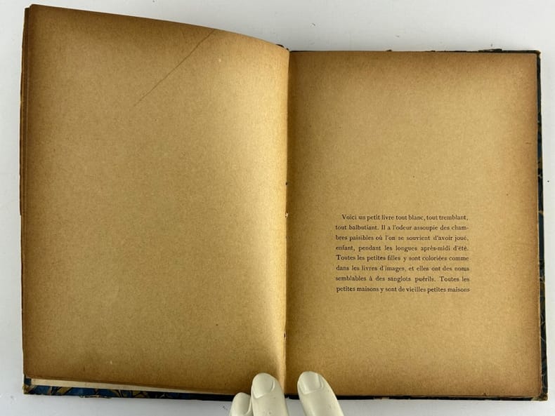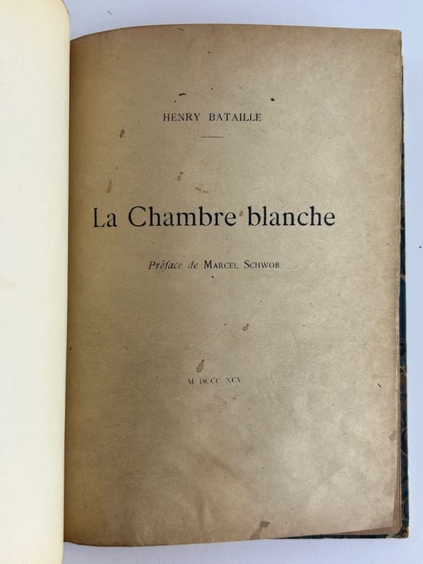 Paris Editions du Mercure de France 1895, 14 x 19 cm, demi-reliure, dos long, titre à l'or, plats de papier marbré, 61p. Edition originale. Premier livre du jeune poète dont Marcel Schwob encouragea les débuts. Couverture conservée. Reliure passée.