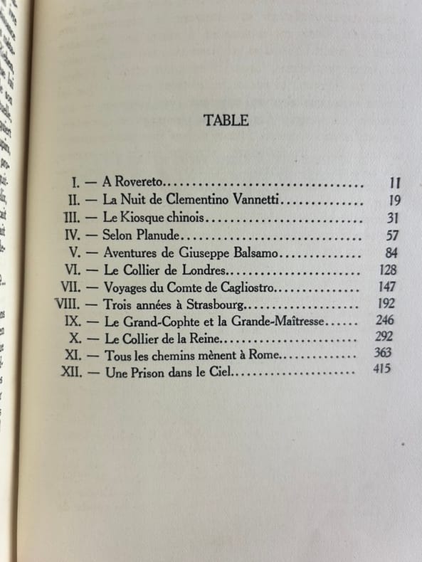 Tables des matières : I. - A Rovereto. II. - La Nuit de Clementino Vannetti III. - Le Kiosque chinois . IV- Selon Planude. V. - Aventures de Giuseppe Balsamo. VI. - Le Collier de Londres. VII. - Voyages du Comte de Cagliostro VIII. - Trois années à Strasbourg. IX. — Le Grand-Cophte et la Grande-Maîtresse X. - Le Collier de la Reine. XI. - Tous les chemins mènent à Rome.. XII. - Une Prison dans le Ciel..