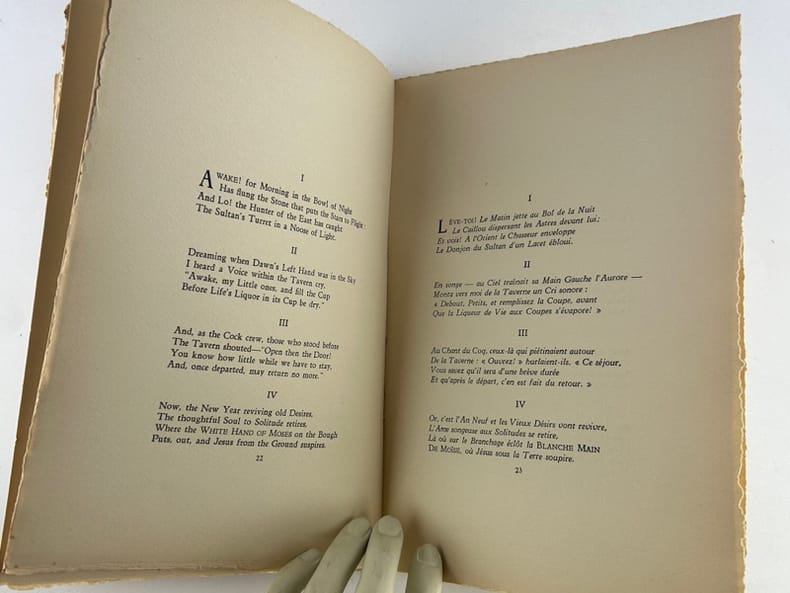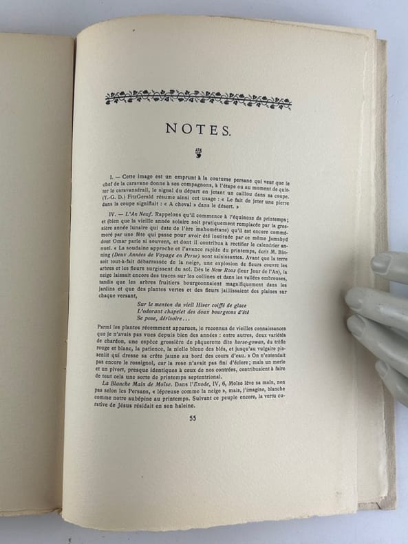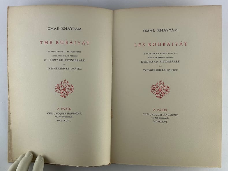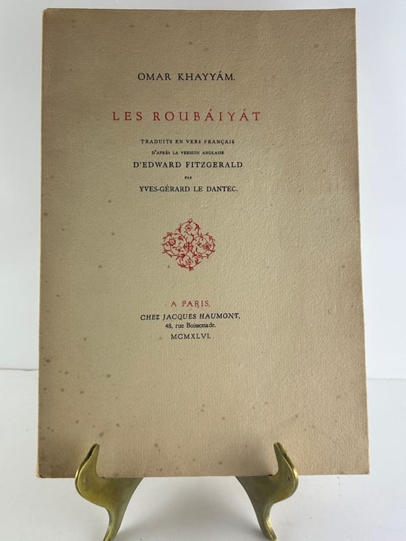 1954 Paris, Editions Falaize, colection: "Les carnets oubliés", 1954. in-8°, 110p. Broché, couverture rempliée. Edition numérotée sur Alfa Mousse. Préface de Yves-Gérard Le Dantec, d'après la version anglaise de Edward Fitzgerald.