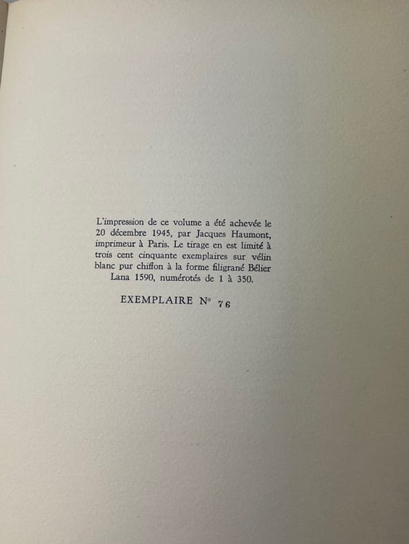 Paris Chez Jacques Haumont 1946, 19,5 x 28 cm, broché sous couverture rempliée, 58p. Texte anglais en regard. Un des 350 exemplaires numérotés sur vélin blanc pur chiffon, seul tirage. Achevé d'imprimer daté au 20 décembre 1945. Légères piqûres, sinon bel exemplaire.