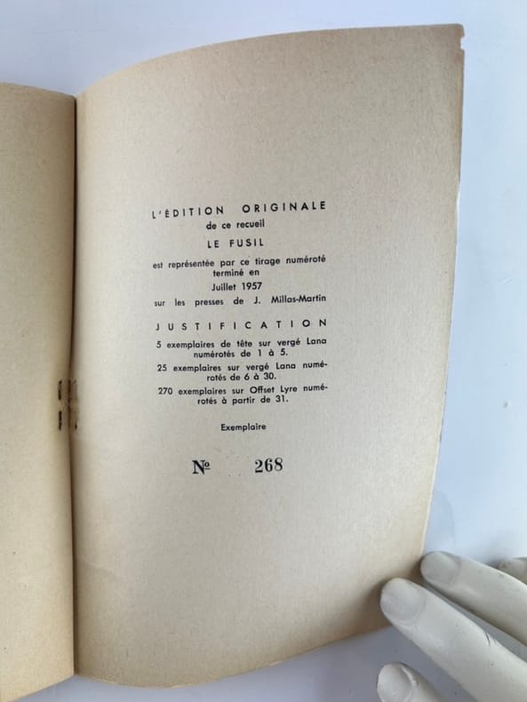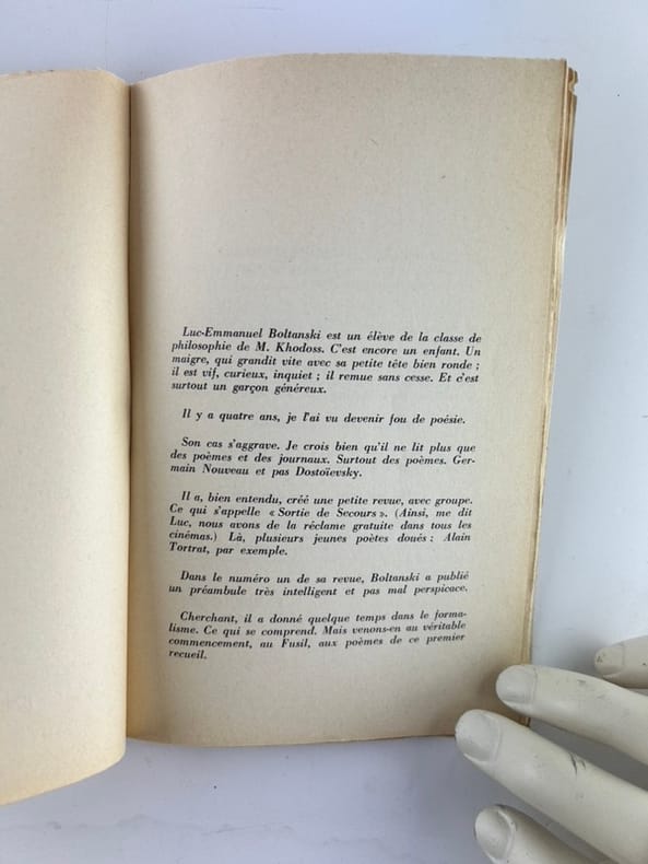 Paris José Millas-Martin, Imp. Juillet 1957, 13x20cm, broché, non paginé Edition originale du premier recueil de Luc Boltanski publié à l'âge de 17 ans. Introduction de Pierre Morhange sur 2 pages suivie de 15 pièces de l'auteur. Un des 270 ex. sur offset après 30 ex. sur vergé Lana. De la bibliothèque du poète Luc Martin avec son cachet sur la page de titre. Bon état.