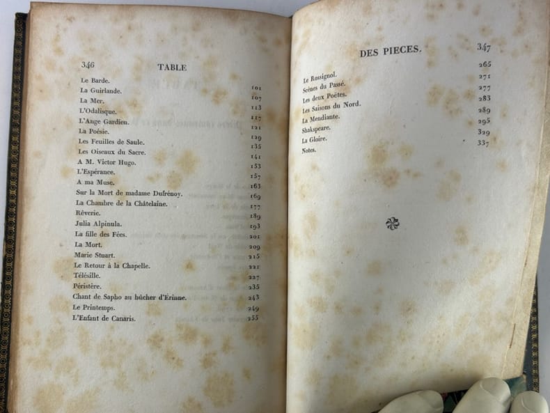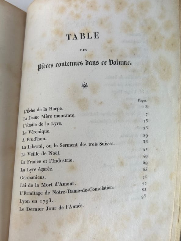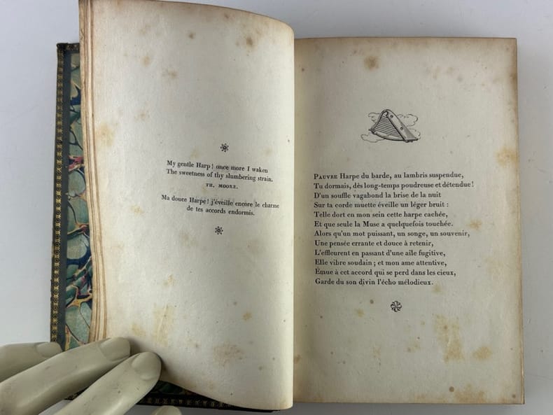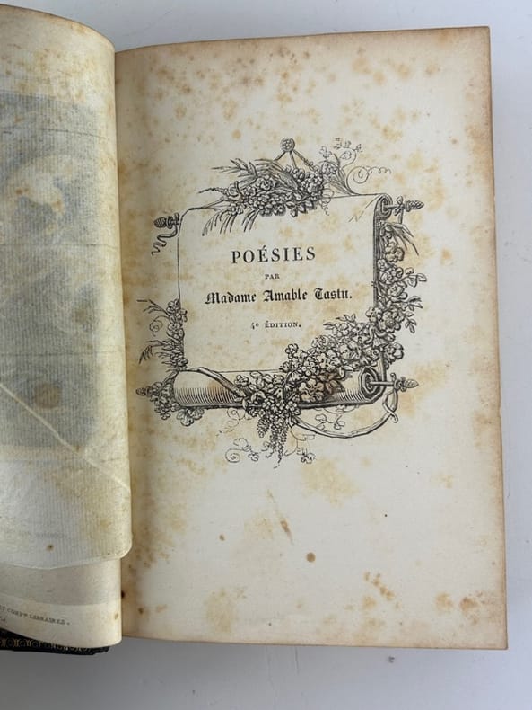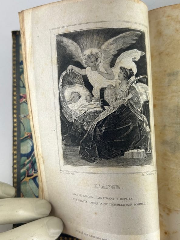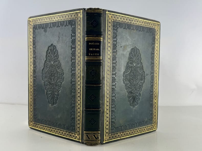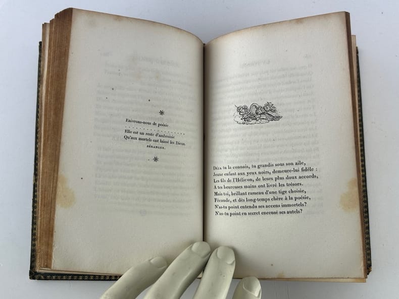 Paris Ambroise Dupont & Cie, Libraires (J. Tastu, Imprimeur) 1827, 11 x 16,5 cm, reliure plein veau vert, dos à 4 faux-nerfs, caissons ornés de fleurons à froid, pièce de titre cuir, plats encadrés de filets et roulette dorés et à froid, rosace centrale, coupes et chasses ornées de roulettes, toutes tranches dorées, 347p. Frontispice "L'Ange" par Achille Deveria, gravé en taille-douce par A. Fauchery. Poèmes illustrés de vignettes et culs-de-lampe. Rousseurs inégales. Quatrième édition, parue un an après l'originale, imprimée par les soins de l'époux de l'auteur, Joseph Tastu. Agréable exemplaire, dans une élégante reliure romantique de l'époque.