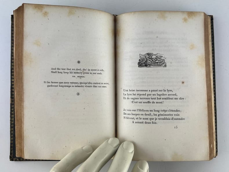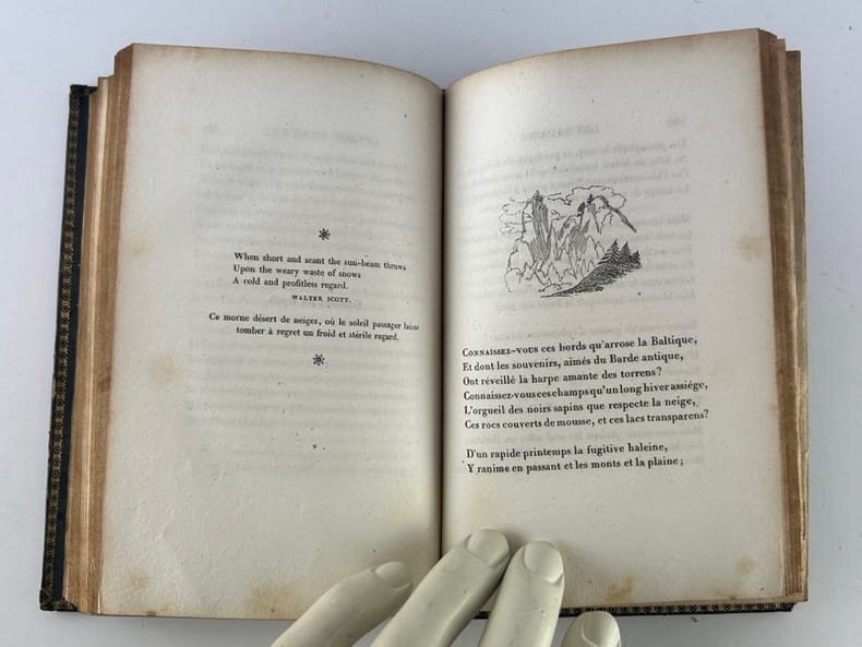Paris, Ambroise Dupont et Cie, 1827. 1 vol. in-12, demi-veau havane, dos lisse orné de triples filets dorés et de fleurons dorés, tranches marbrées. Reliure légèrement postérieure. Ex-libris gravé au contreplat et ex-libris gravé de André de la Motte Saint-Pierre au v° de la garde. Frontispice hors-texte de Devéria gravé en taille-douce par A. Fauchery sur chine appliqué, titre gravé, vignette gravée sur bois dans le texte, (2) ff., 347 pp. Quelques rousseurs.