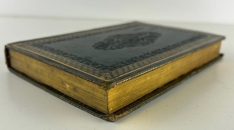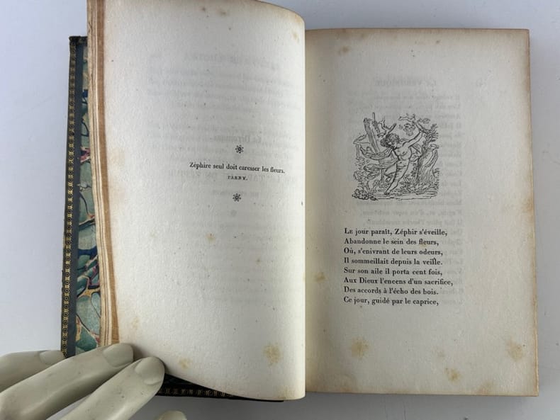 A Paris chez Louis Janet et de l'Imprimerie de J Didot l'Aîné sd (1804). In-12 XX 301pp. Pleine basane vert foncé, dos à 4 nerfs guillochés à froid et rehaussés de filets dorés, pastilles dorées dans les entrenerfs, filets dorés en tête, filets et frise dorés en queue, plats encadrés d'un filet doré et 1 chaînette à froid avec au centre 1 grand losange à froid de volutes et fleurettes, tranches marbrées, rel époque. orné d'une vignette sur le titre et 5 jolies gravures hors texte.