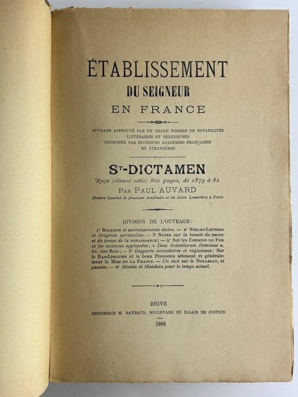 Brive Imprimerie M. Raynaud 1903, in-8 (16 x 25 cm), broché, 628p. Edition originale. Témoignages in fine. Bon exemplaire, texte frais.