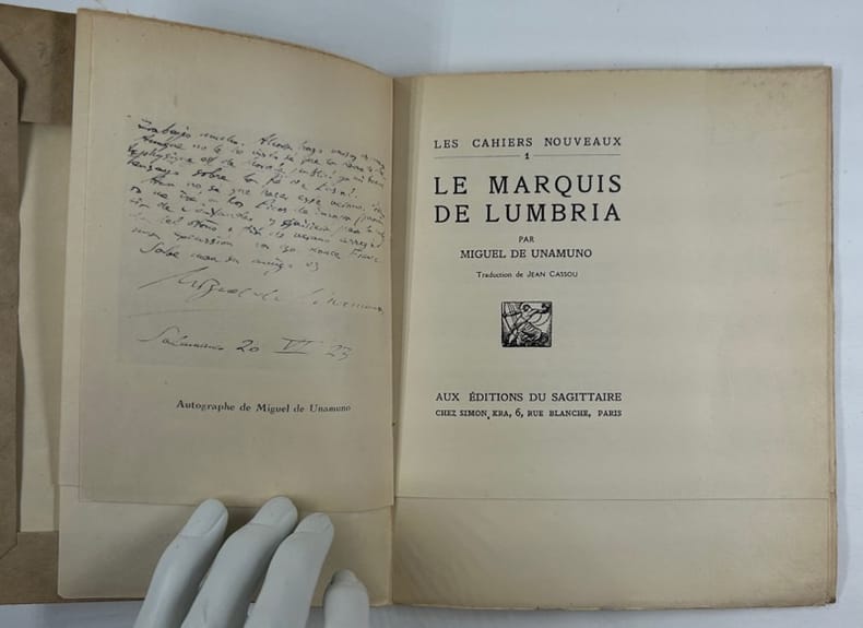 Le Sagittaire, 1924. In-12 br. Coll. " Les cahiers nouveaux ". Traduit par Jean Cassou. Fac-similé d'un texte d'Unamuno en frontispice. E.O. Ex. num. sur Ingres, non coupé.