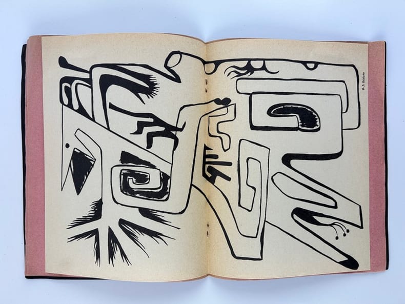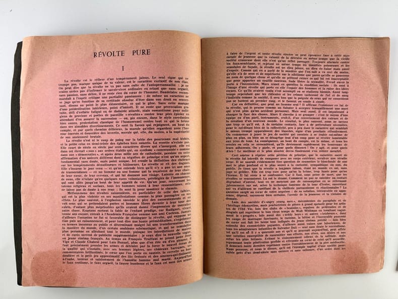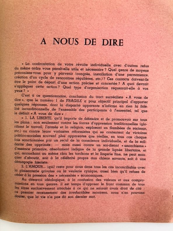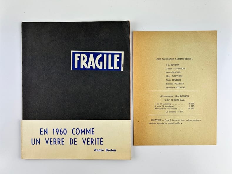 Orsay Chez Guy BODSON 17x21cm agrafé 16p. L'un des 3 numéros parus entre 1959 et 1960. Celui-ci paru en 1960 répondant au tract surréaliste "A vous de dire", daté du 9 février 1960. Revue très imprégnée de surréalisme et de la figure de Benjamin Péret. Elle fut fondée par Guy Bodson proche de Guy Debord. (Source Biblio. Kandinsky / Fond Destribats ) Illustration en double page de Guy Bodson intitulée "Réduction perpétuelle". Complet de la feuille volante mentionnant les collaborateurs du présent numéro et du bandeau " En 1960 comme un verre de vérité. André Breton". Bon état hormis une tache en bas de page.