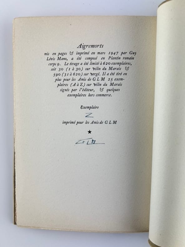 Paris Guy Lévis Mano GLM mars 1947 11,5x16cm broché, couverture rempliée 68p. Edition originale. Tirage justifié à 625 ex. Un des 25 ex. sur vélin du Marais numérotés de A à Z, et réservés à ses amis et paraphé par l'éditeur.