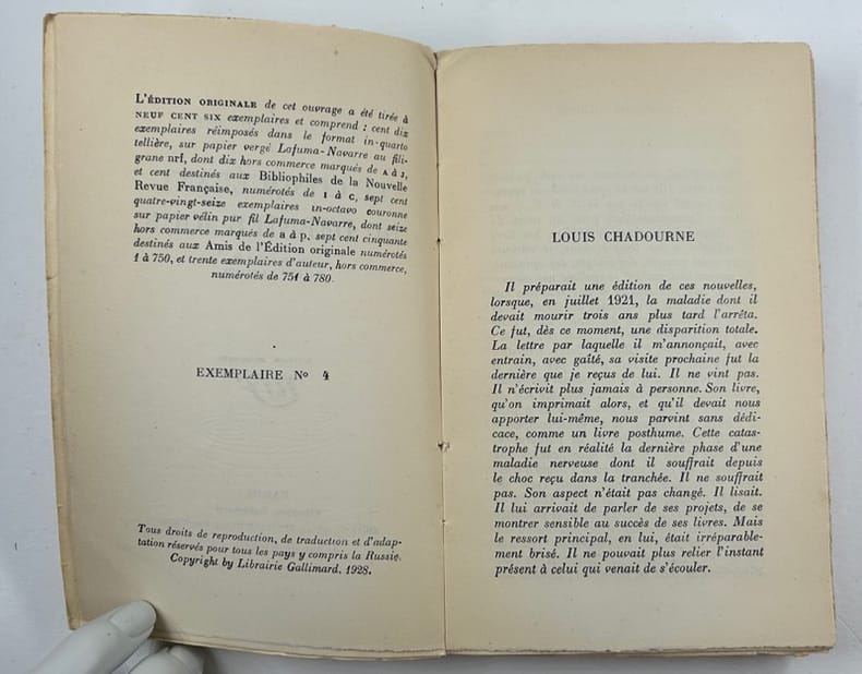 Paris Gallimard, collection Blanche 1928, in-8, broché, 250p. Un des 750 ex. in-octavo couronne sur vélin pur fil Lafuma-Navarre destinés aux Amis de l'EO (dont 16 h.c.), après 110 ex. réimposés dans le format in-quarto tellière sur vergé Lafuma-Navarre (dont 10 ex. h.c.) et 100 ex. destinés aux Bibliophiles de la NRF. Suivent 30 ex. d'auteur h.c. Bon état.