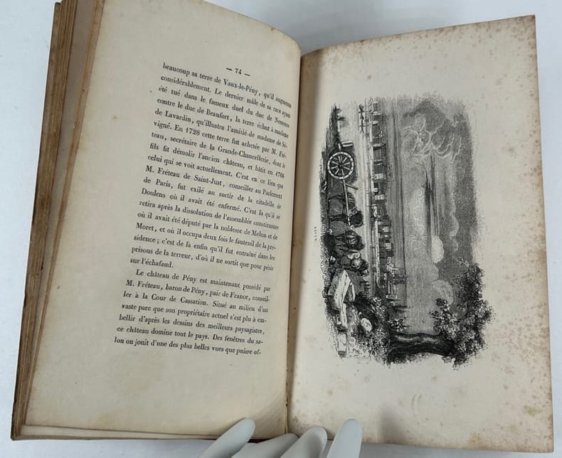 Paris, Au bureau de la publication, 1836. In-8, demi veau époque, dos lisse orné de filets, d'arabesques et de fleurons dorés, titre doré, toutes tranches marbrées, 192 pp. Edition originale illustrée de 4 plans dépliants et de 46 gravures hors texte par Marville et Foussereau et ornée de 2 bandeaux, 2 lettrines et 1 cul-de-lampe. Coupes légèrement usées, épidermures sur les plats, mors inférieur fendu sur 2cm en tête, plat insolés, manque et trace d'un choc sur la coiffe supérieure, quelques rousseurs sur les planches.