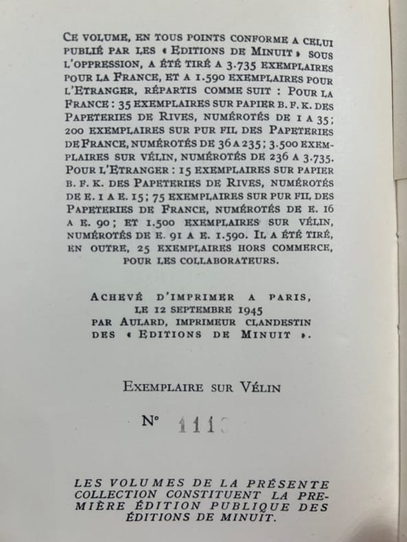 Paris Editions de Minuit, Collection Témoignages 1963, in-12, broché, 45p. Volume conforme à celui publié par Les Ed. de Minuit sous l'oppression. Un des 3500 ex. sur vélin publiés pour la France. Bel état. Non coupé.