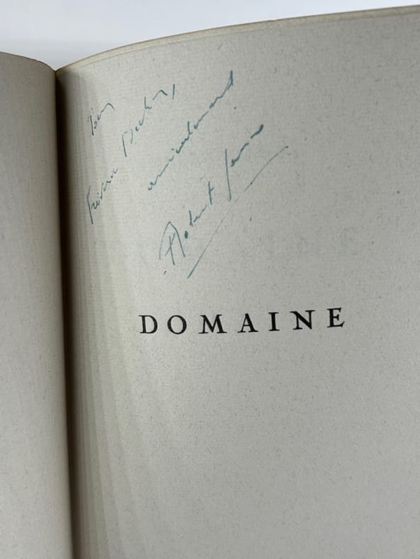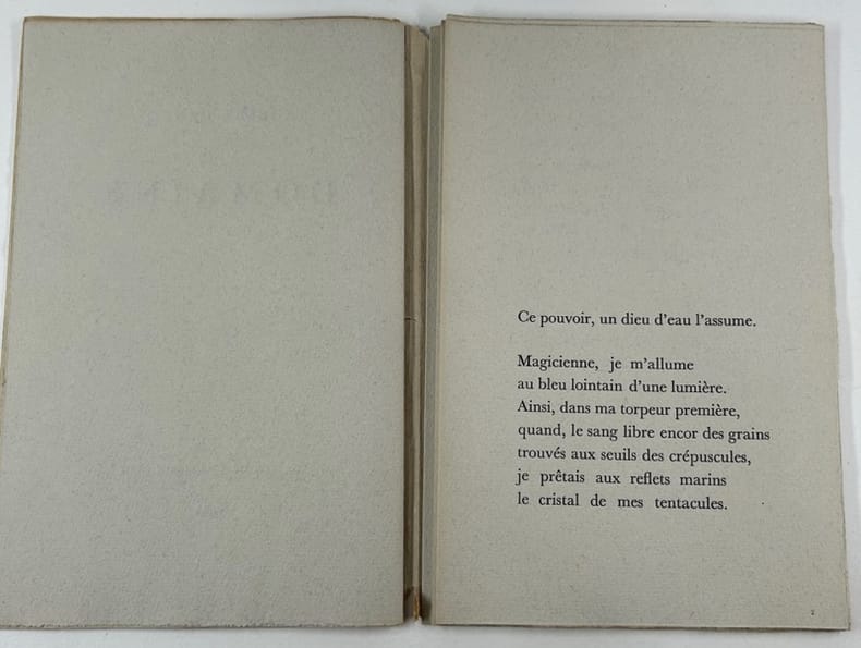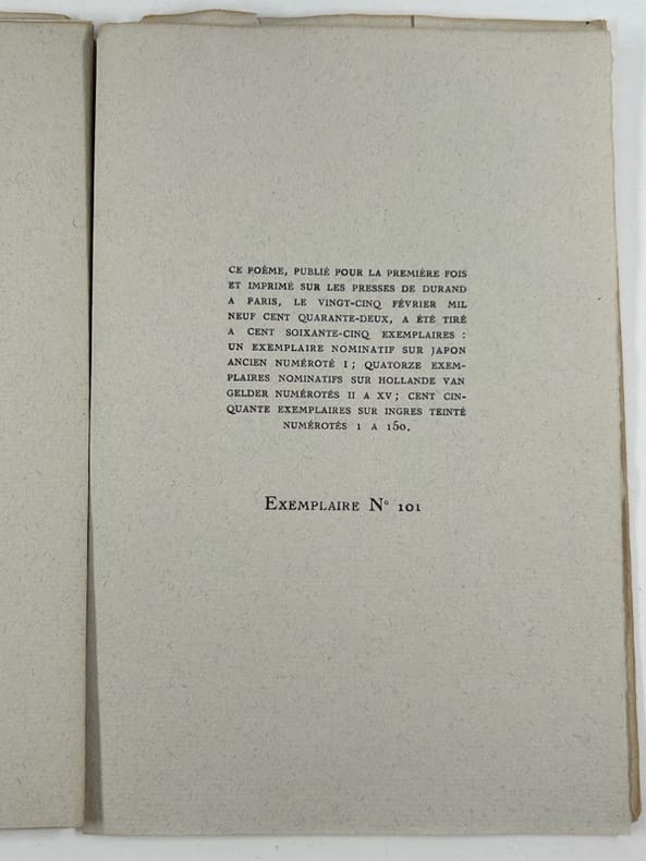 Paris L.F.P. 1942, in-8, en feuilles, sous couverture rempliée, np. Edition originale. Un des 150 ex. sur Ingres teinté, après 1 ex. nominatif sur Japon et 14 ex. nominatifs sur Hollande. Couverture un peu passée, sinon bel état.
