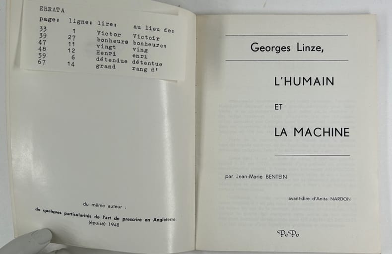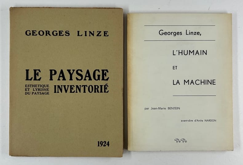 Liège Editions du Groupe Moderne d'Art de Liège 1924, in-8, broché, 52p. Edition originale. Un des 600 exemplaires numérotés (dont 50 signés). Bel état. JOINT "Georges LINZE, L'Humain et la Machine" par Jean-Marie BENTEIN. Avant-dire d'Anita NARDON, Bruxelles - Evere, Pe Po, 1972, in-12, 67p.