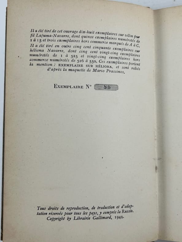 In-12, broché, 145 p. Paris, Gallimard, 1943.