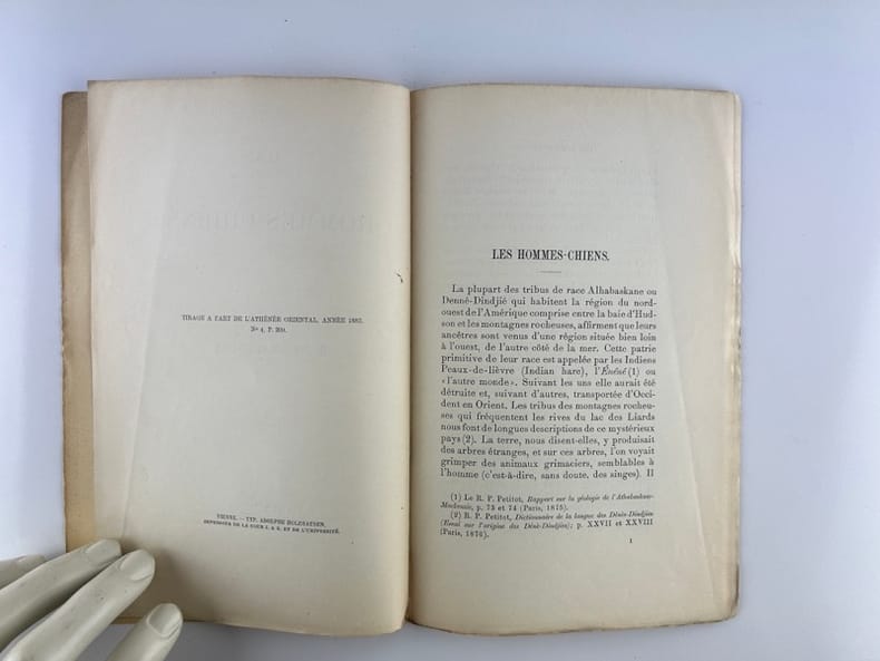 Paris Chez l'auteur. 92, rue du Cherche-Midi 1882 14x22cm broché 28p. Bon état. Tiré à part de la revue L'Athénée oriental, n°4 -1882. Etude sur les Indiens Alhabaskane ou Denné-Dindjié du Nord-Ouest de l'Amérique. Ce peuple vivait sous le joug de magiciens qui la nuit se transformaient en chiens.