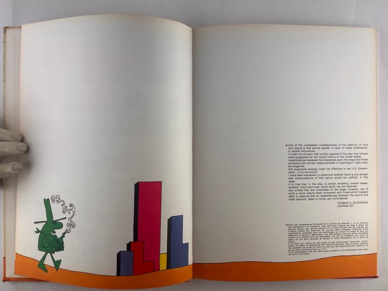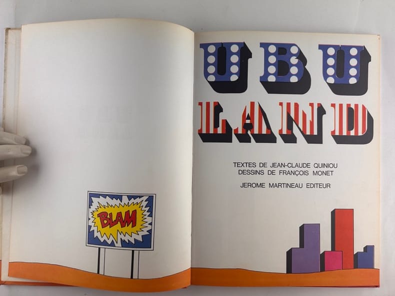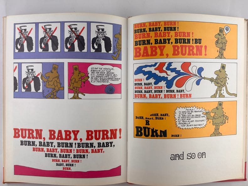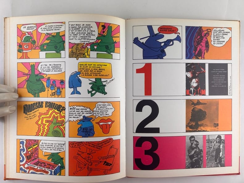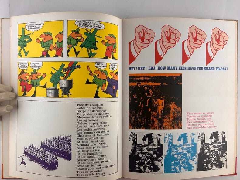 Les USA, pays aussi délirant que le pays d'Ubu imaginé par Jarry, avec des photos-trait réalisées à partir de documents Associated Press et des photos sur le Vietnam extraites du livre "Vietnam ! Vietnam ! " de Félix Greene