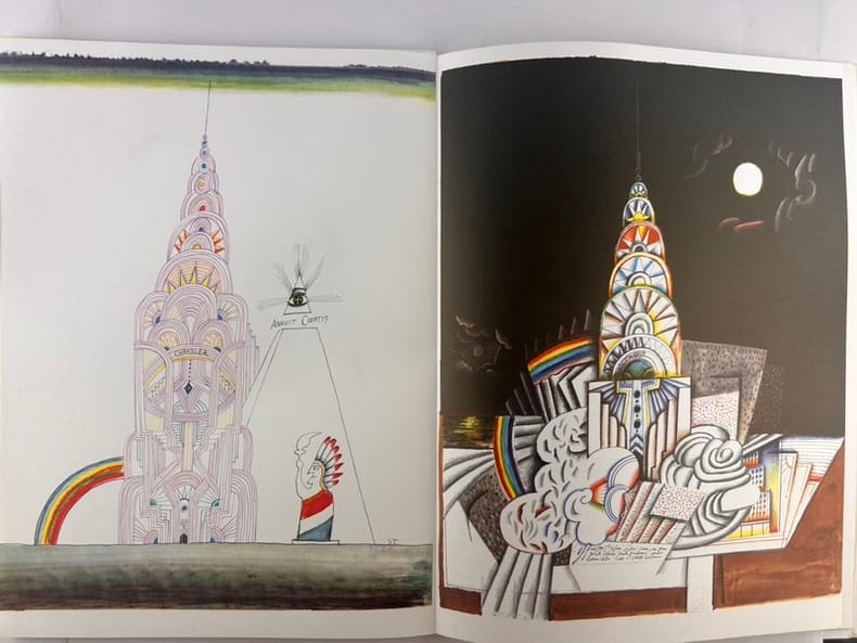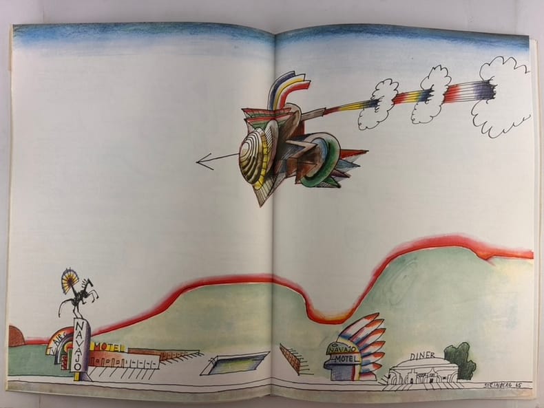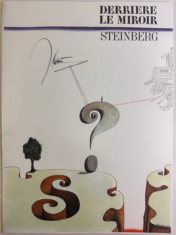 Paris, Maeght éditeur, 1966. In-folio (380 x 280 mm) en feuilles, 24 pages. 19 reproductions dont 7 en couleurs et 2 en double page. DLM pour l'exposition STEINBERG à la Galerie Maeght en mars 1966 : 67 dessins et collages de 1964 et 1965. DLM entièrement calligraphié, illustré et composé par Steinberg.