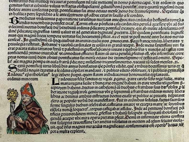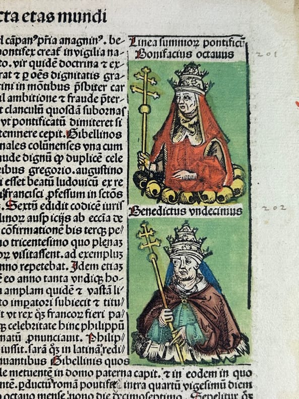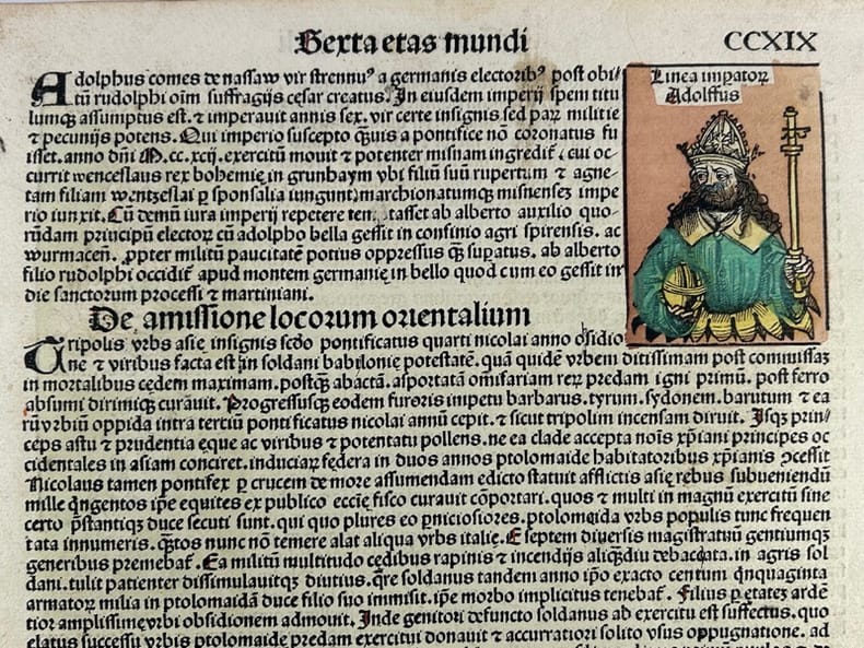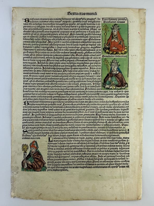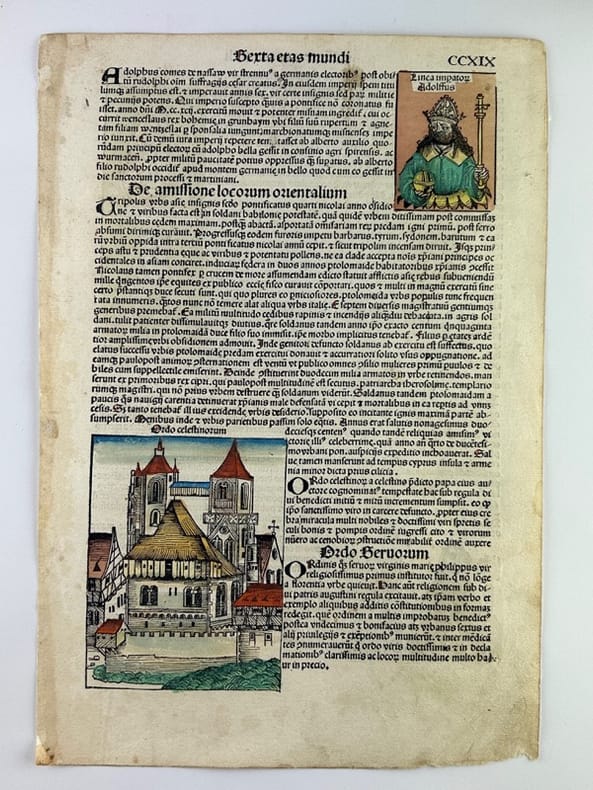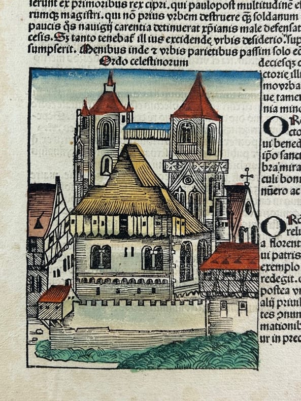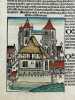 Nuremberg 1493 27,5x40cm Planche originale de l'édition latine, colorisée à l'aquarelle à la main. Tache marginale.