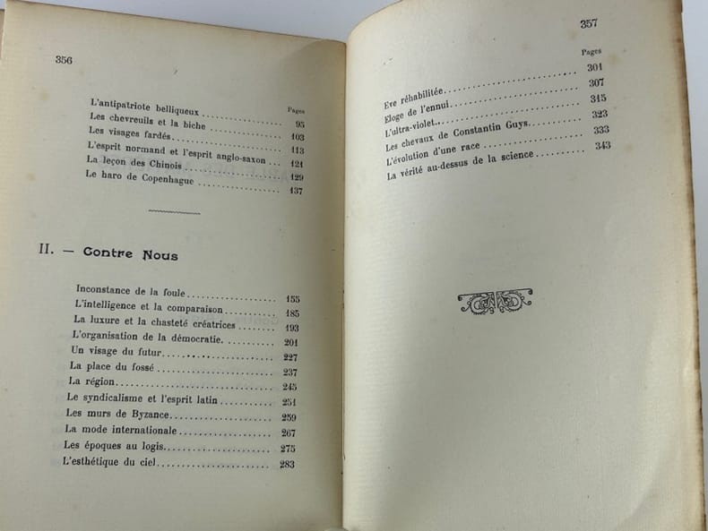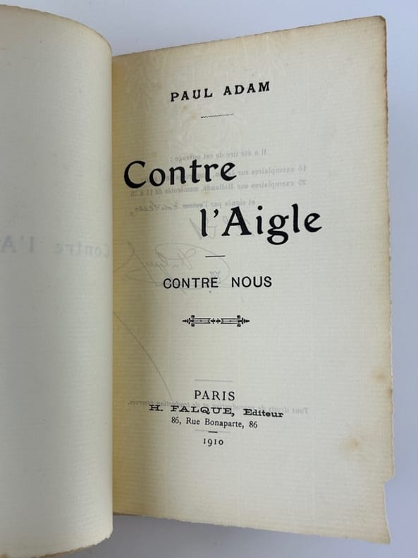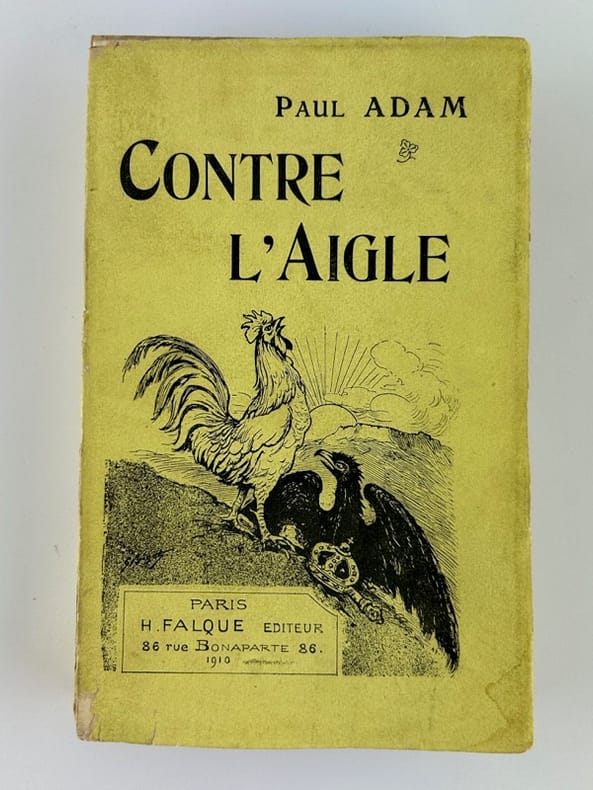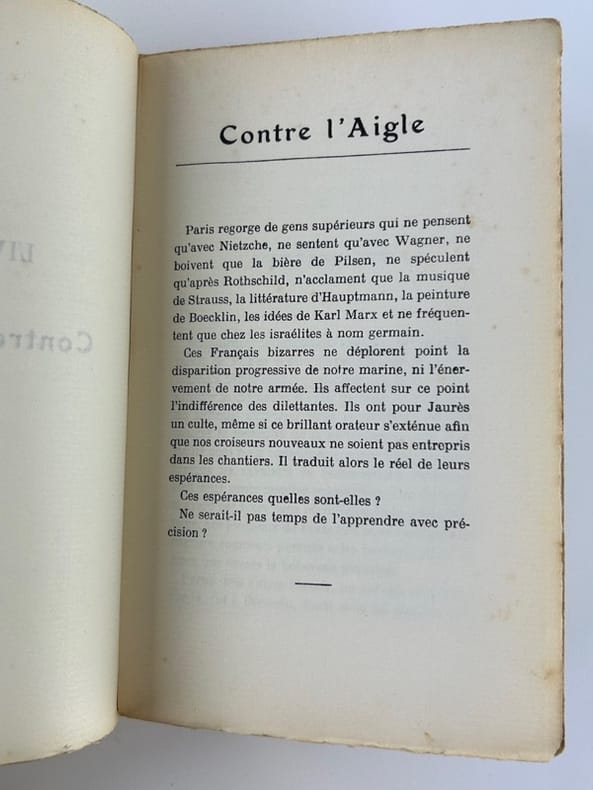 Paris H. Falque 1910 1 vol. relié in-12, demi-basane chagrinée aubergine, dos à nerfs, plat supérieur de la couverture conservé, 357 pp. Edition originale sans grand papier de ce recueil de chroniques nationalistes. Belle couverture illustrée d'un coq dominant l'aigle noir. Dos passé et mors un peu usés, sinon bon exemplaire.