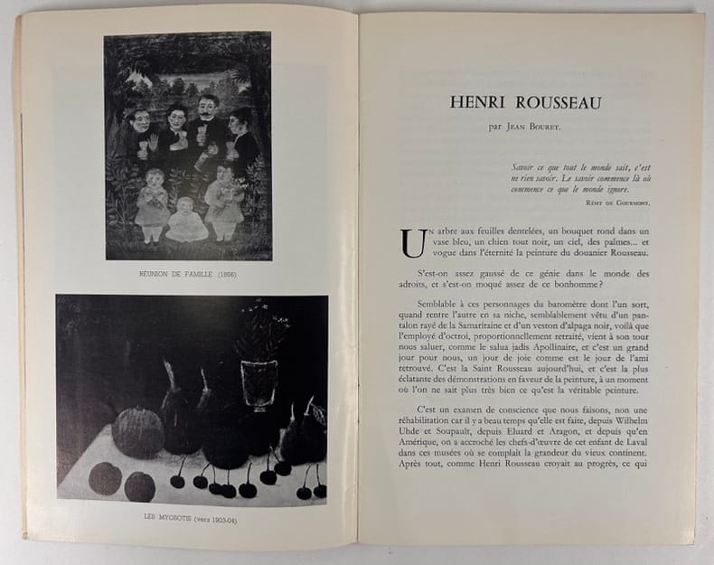 in-8 agrafé 46 reproductions. 100 numéros. Préface de Raymond Nacenta. Texte de Jean Bouret. Notes bio. sur Henri Rouuseau par Maximilien Gauthier.