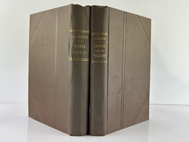 Paris Albin Michel Editeur sd, in-12 modeste reliure toilée marron, titre à l'or, 447 & 318 pp. Bon état. Exemplaires solides et propres, texte frais. Parus en 1919, ces deux ouvrages violemment antiguerre font scandale. Le soldat Clavel est le porte-parole des impressions et des idées de Werth, sur le front comme dans les hôpitaux. Henri Barbusse et Jean Norton Cru expriment leur admiration pour ces ouvrages que les historiens considèrent aujourd'hui comme des documents (wikipédia).