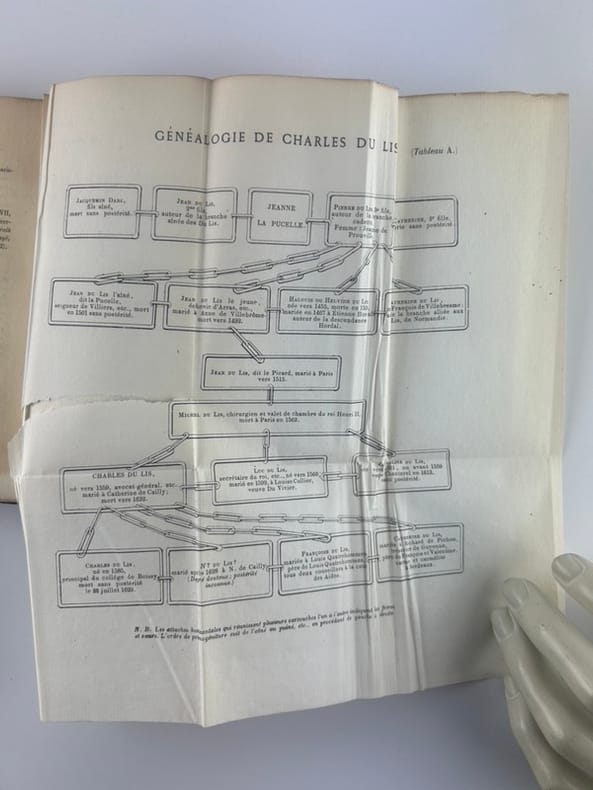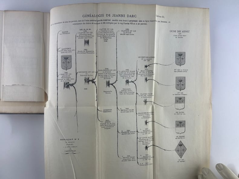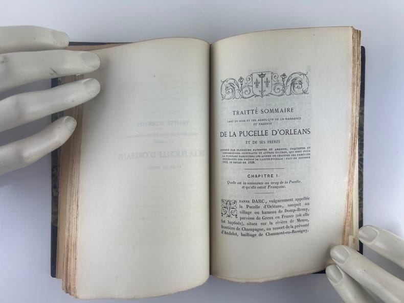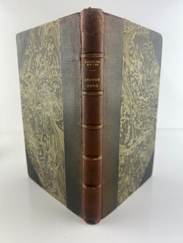 Paris Aug. Aubry/ Coll. Le trésor des pièces rares ou inédites 1856, 12x18,5cm, demi-chagrin à nerfs, 112p. Tirage limité à 350 exemplaires. Un des 330 ex. sur vergé. Deux planches dépliantes en fin d'ouvrage pour la Généalogie de Jeanne d'Arc et de Charles du Lis. ( déchirure sans gravité). Epidermures à la reliure avec un mors très légèrement ouvert sur quelques mm.