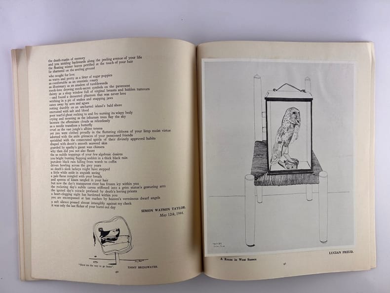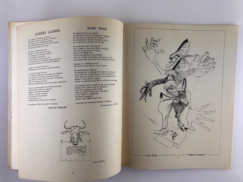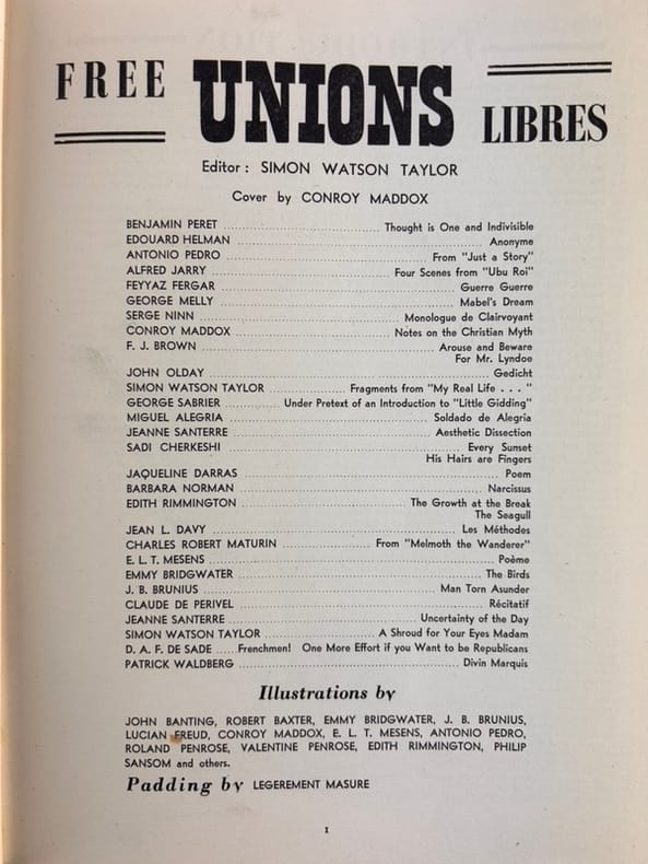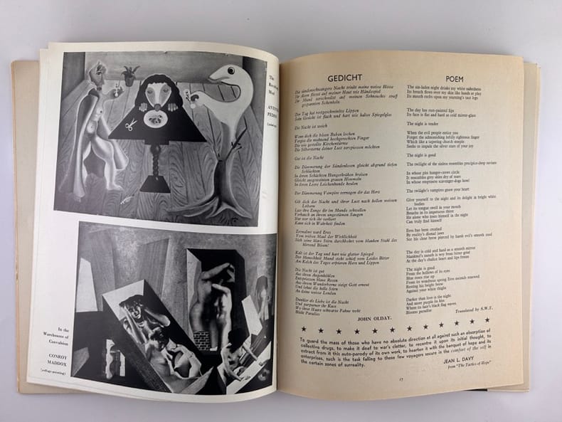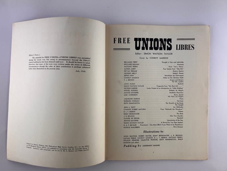 London 1946, 22x28cm, soft cover, 48p. First an only issue of this english publication on surrealim. Good condition. B/ W illustrations and plates. TEXT BY BENJAMIN PERET EDOUARD HELMAN ANTONIO PEDRO ALFRED JARRY FEYYAZ FERGAR GEORGE MELLY SERGE NINN CONROY MADDOX F. J. BROWN JOHN OLDAY SIMON WATSON TAYLOR GEORGE SABRIER MIGUEL ALEGRIA JEANNE SANTERRE SADI CHERKESHI JAQUELINE DARRAS BARBARA NORMAN EDITH RIMMINGTON etc..ILLUSTRATIONS BY JOHN BANTING, ROBERT BAXTER, EMMY BRIDGWATER, J. B. BRUNIUS, LUCIAN FREUD, CONROY MADDOX, E. L. T. MESENS, ANTONIO PEDRO, ROLAND PENROSE, VALENTINE PENROSE, EDITH RIMMINGTON, PHILIP SANSOM