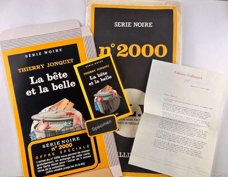 Paris Gallimard 1985, Ensemble comprenant dans une enveloppe grand format un présentoir cartonné à monter et un exemplaire du n°2000 de la série noire "La belle et la bête". Quelques froissements sur l'enveloppe, sinon très bon état.