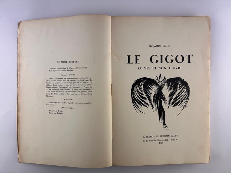 Paris Libraire Le Terrain Vague 1957, in-4 (21x30cm), broché, 269p. Un des 1050 ex. du second tirage sur vergé du Marais après 56 ex. de tête constituant l'édition originale. Recueil de 24 textes de Peret précédemment parus dans des revues ou plaquettes. Quelques rousseurs sur la couverture.