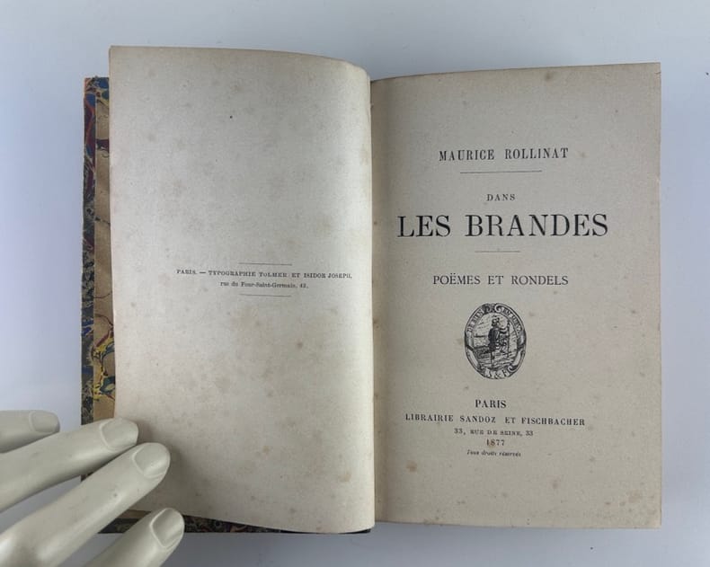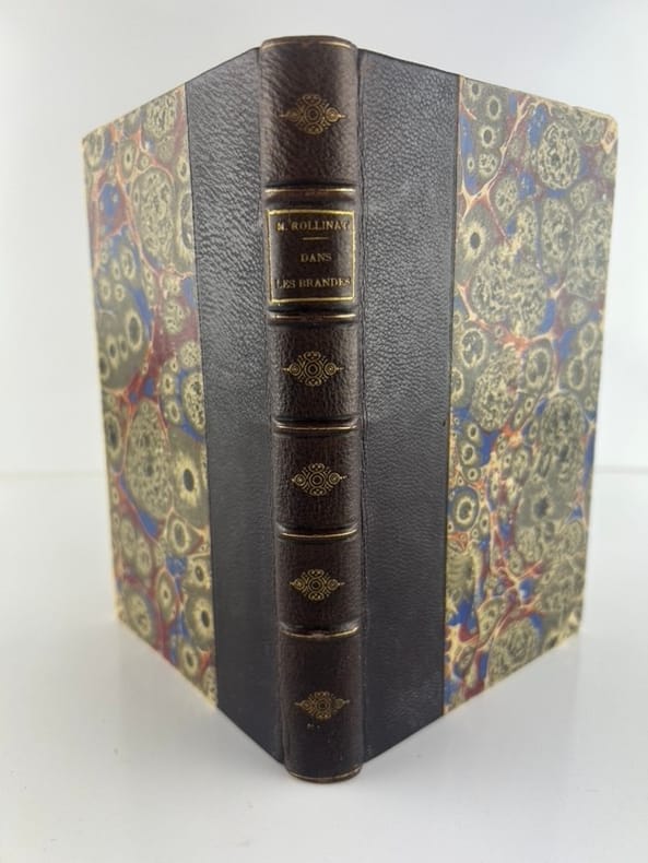 librairie Sandoz et Fischbacher "Paris, 1877, in-12 demi-maroquin rouge à coins. Plats de couverture et dos conservés. Tête dorée. Reliure vers 1920. 287pp. Edition originale du premier livre de Rollinat, dédié à la mémoire de George Sand, décédée en 1876, la grande amie de son père. Selon les dires de Maurice Rollinat, Dans les brandes ne connut aucun succès. Envoi autographe de l'auteur ""A ma chère petite tante, Emma Poterlet, respectueux hommage de la plus tendre affection"". Julie Angèle Emma Didion, épouse d'Auguste Barthélémy Poterlet, est la tante et marraine de Maurice Rollinat. Quelques rares rousseurs. Très belle provenance."