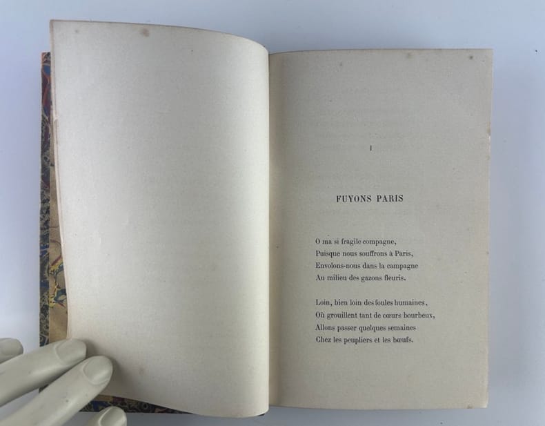 Paris Librairie Sandoz et Fischbacher 1877, in-8, demi-reliure vélin blanc de l'époque, dos à nerfs orné de fleurons, pièce de titre cuir, 287p. Edition originale de ce premier recueil de poèmes dédiés à la mémoire de George Sand. Ex-libris "conventus sancti Leonardi". Bon état.