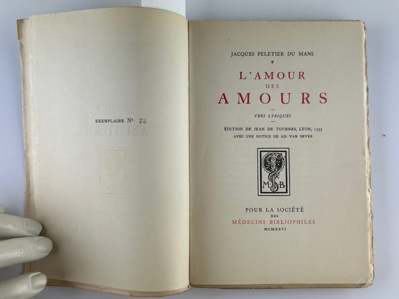 Paris Pour la Société des Médecins Bibliophiles 1926, in-8, broché sous couverture rempliée, Edition de Jean De Tournes, Lyon, 1555, avec une notice de Ad. Van Rever. Un des 145 ex. sur vélin, après 130 ex. sur vergé blanc. Bel état. Non coupé.