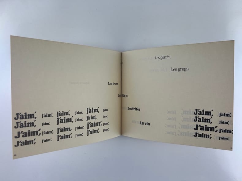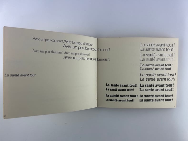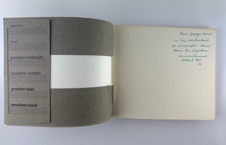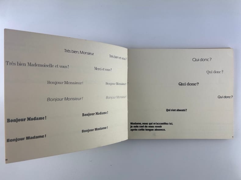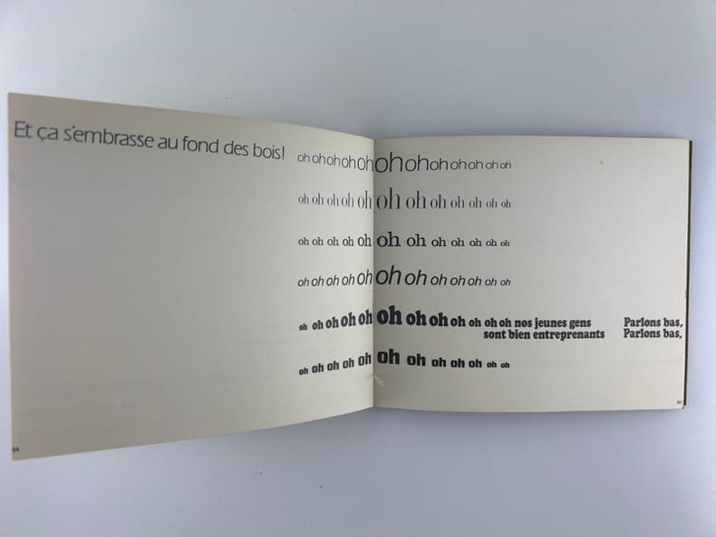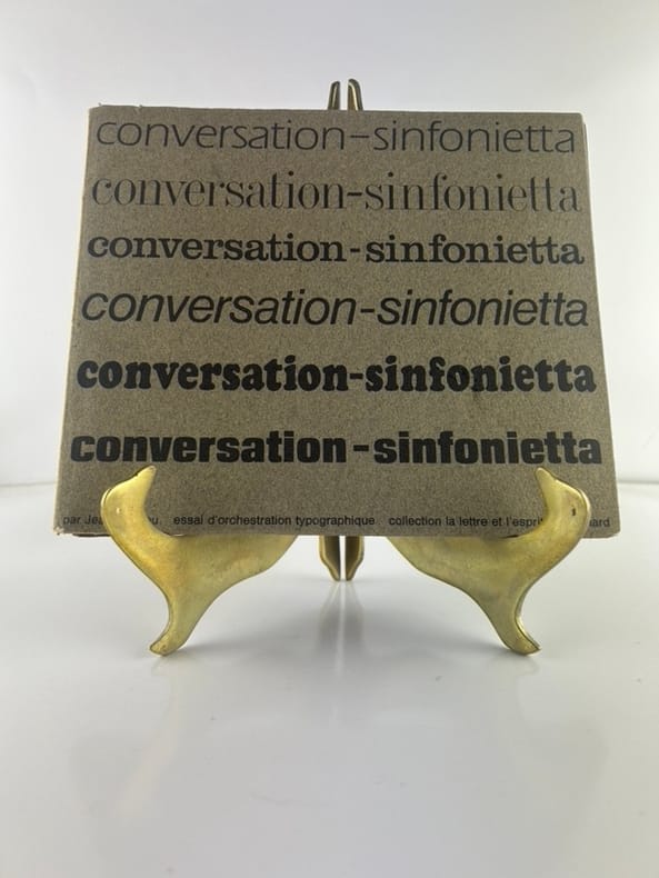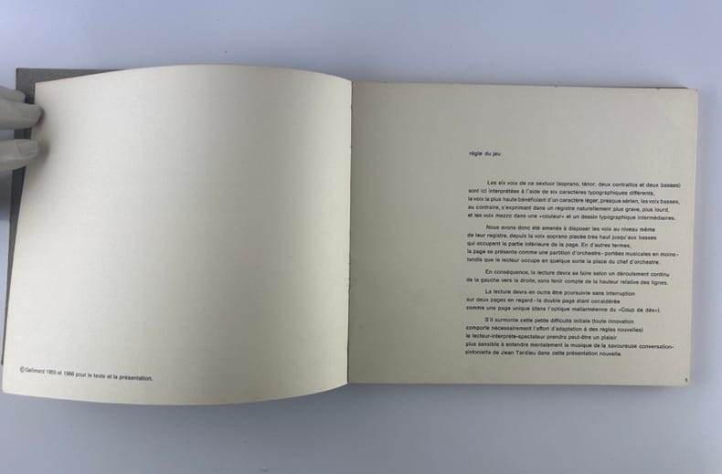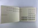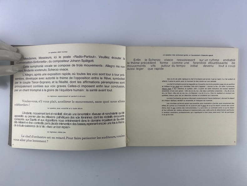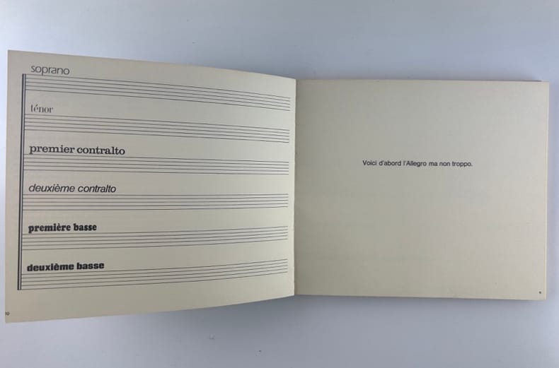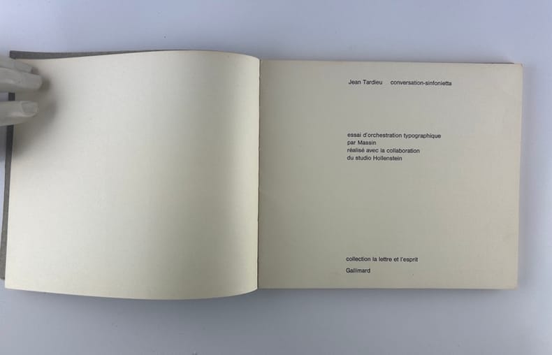 Edition originale au tirage limité à 1650 exemplaires sur offset mat ivoire de Bellegarde, celui-ci un des 1500 numérotés en arabe (132)."Règle du jeu: Les six voix de ce sextuor (soprano, ténor, deux contraltos et deux basses) sont ici interprétées à l'aide de six caractères typographiques différents, la voix la plus haute bénéficiant d'un caractère léger, presque aérien, les voix basses, au contraire, s'exprimant dans un registre naturellement plus grave, plus lourd, et les voix mezzo dans une «couleur» et un dessin typographique intermédiaires.Nous avons donc été amenés à disposer les voix au niveau même de leur registre, depuis la voix soprano placée très haut jusqu'aux basses qui occupent la partie inférieure de la page. En d'autres termes, la page se présente comme une partition d'orchestre – portées musicales en moins – tandis que le lecteur occupe en quelque sorte la place du chef d'orchestre.S'il surmonte les petites difficultés initiales (toute innovation comporte nécessairement l'effort d'adaptation à des règles nouvelles) le lecteur-interprète-spectateur prendra peut-être un plaisir plus sensible à entendre mentalement la musique de cette savoureuse conversation-sinfonietta dans cette présentation nouvelle". La librairie sera fermée du mardi 14 au jeudi 16 avril inclus. - The bookshop will be closed from Tuesday 14 to Thursday 16 April inclusive.