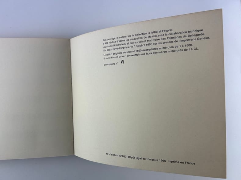 Paris Gallimard. Collection La Lettre et l'Esprit 1501 21x18cm,, broché sous couverture rempliée, 81p. Second ouvrage de la collection La Lettre et l'Esprit réalisé d'après les maquettes de Massin et la collaboration technique du studio Hollenstein. Un des 150 ex. hors commerce tirés sur offset mar ivoire après 1500 exemplaires.
