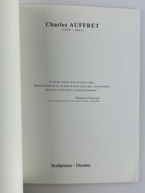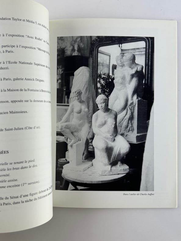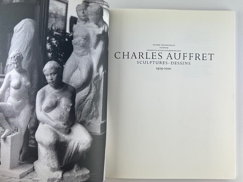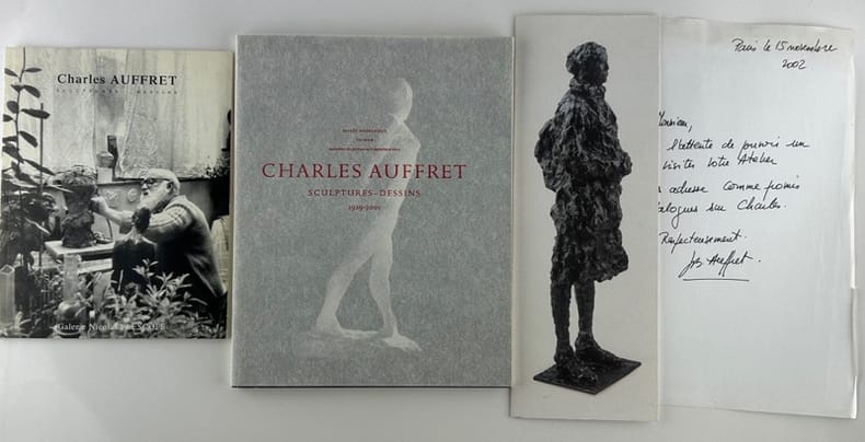 Voiron Musée Mainssieux 2002, in-4, broché, Nombreuses reproductions nb. Expostions - catalogue des dessins, sculptures et médailles exposés. Joint : carte de voeux Galerie Malaquais, avec envoi envoi de Jean-Baptiste Auffret & le catalogue de la Galerie Nicolas Plescoff "Charles Auffret - Sculptures - Dessins", avec entretien de Ch. Auffret avec René Lesné.