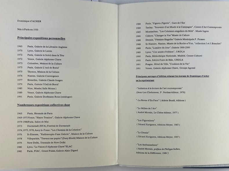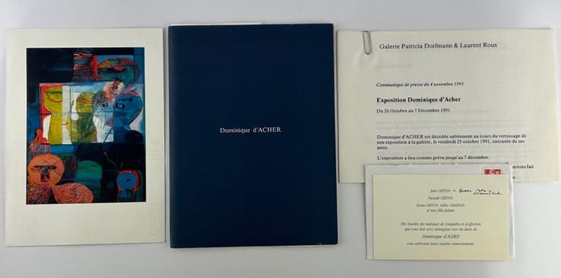 Paris Galerie Patricia Dorfmann & Laurent Roux 1991, 16 x 21,5 cm, en feuilles, np. 6 reproductions couleurs - principales expositions - expositions collectives - ouvrages. Première rétrospective de l'artiste. Joint le carton d'invitation & le communique de presse, à la suite du décès de l'artiste au cours vernissage.