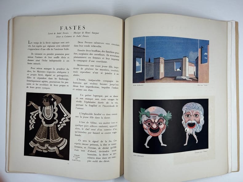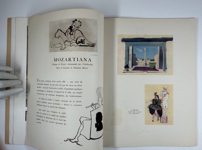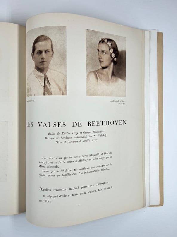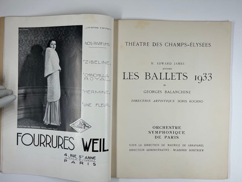 Paris Editions des Quare Chemins 1933, in-4, broché, (6), 15p., (8) Bel exemplaire. MOZARTINA : Musique de Mozart instrumentée par Tchaikowsky. Décor et costumes de Christian Bérard. LES SONGES : Livret de André Derain. Musique de Darius Milhaud. Décors et costumes de André Derain. L'ERRANTE : Fantaisie chorégraphique de Pavel Tchelitchew et Georges Balanchine sur la musique de Schubert, instrumentée par Charles Koechlin. Décor et costumes de Pavel Tchelitchew. LES SEPT PÉCHÉ CAPITAUX.: Spectacle sur les poèmes de Bert Brecht. Musique de Kurt Weill. Décor et costumes de Caspard Neher. FASTES : Livret de André Derain. Musique de Henri Sauguet. Décor et costumes de André Derain. LES VALSES DE BEETHOVEN : Ballet de Emilio Terry et Georges Balanchine. Musique de Beethoven instrumentée par N. Nabokoff. Décor et costumes de Emilio Terry. Tous les costumes pour les BALLETS 1933 ont été exécutés par Madame Karinsky.