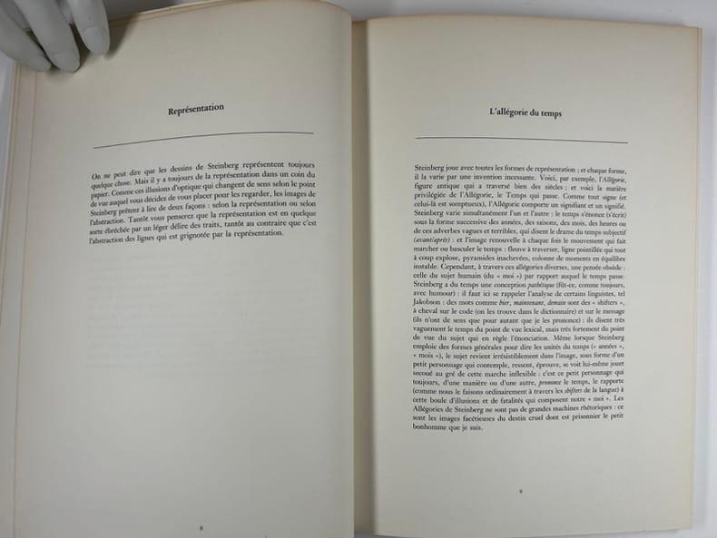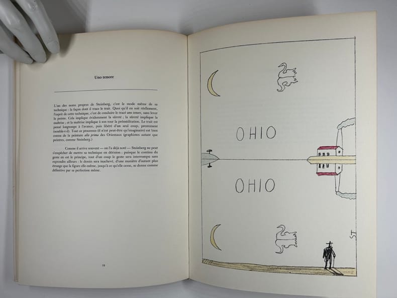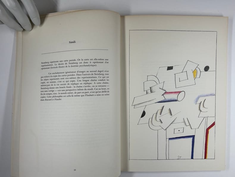 Editions d'art " Repères " [Galerie Maeght, éditeur]. 1983. In-4° broché. Couverture, frontispice et 9 dessins hors texte de Saul Steinberg, dont 6 en couleurs, réalisés spécialement pour ce livre. 71 pages. E.O. sur papier ordinaire (qui est quand même un fort vélin ivoire).