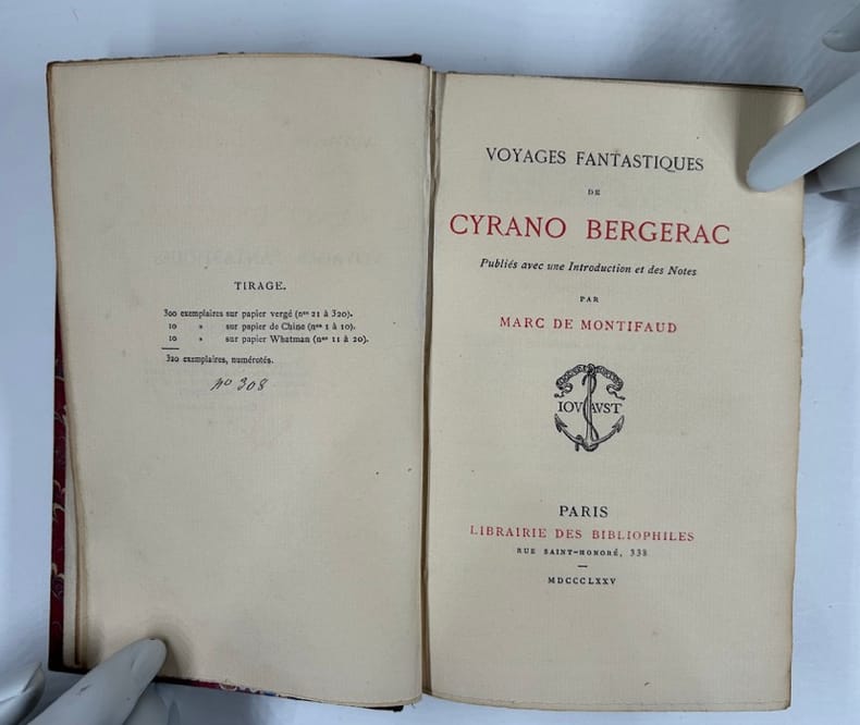 Paris Librairie des Bibliophiles 1875 in 12 (17,5x11) 1 volume broché, couverture imprimée rempliée, LXXIII et 281 pages [3], non rogné. Tome premier renferme: Histoire comique des estats et empire de la lune, Histoire comique des estats et empire du soleil. Tirage limité à 320 exemplaires numérotés, celui-ci un des 300 exemplaires numérotés sur papier vergé. Bel exemplaire