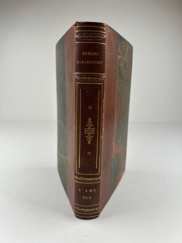Edition originale sur papier courant. Reliure en demi chagrin chocolat, dos à cinq nerfs, encadrement d'un filet doré sur les plats de papier marbré, gardes et contreplats de papier à la cuve, tranches marbrées. Envoi de Edmond Haraucourt à l'un de ses amis, enrichi d'un second envoi plus tardif d'Edmond Haraucourt à André Tudesq. Ex-dono d'André Tudesq à la plume en guise d'ex-libris. Quelques petites rousseurs sans gravité. - Photographies et détails sur www.Edition-Originale.com -