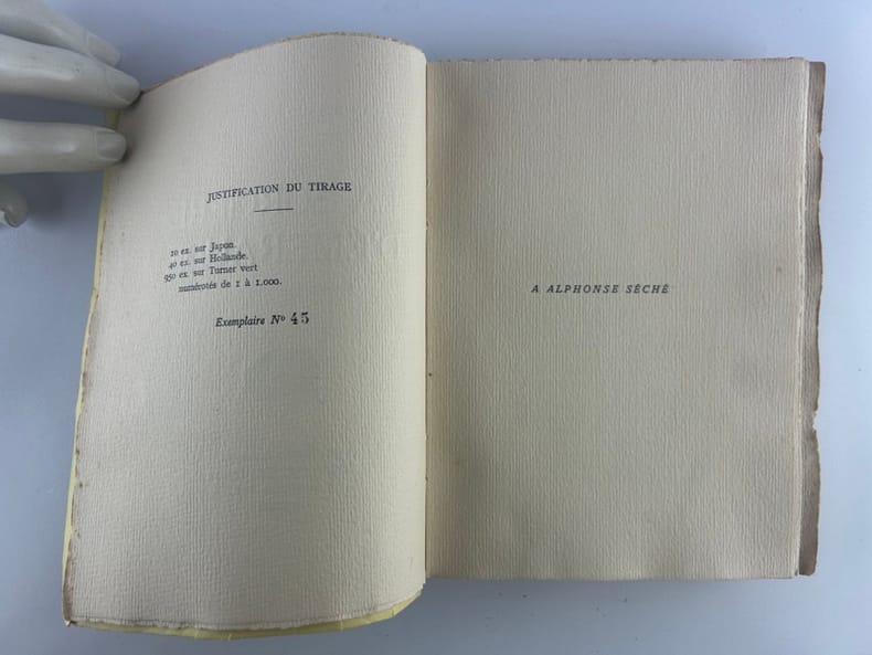Paris Editions Malfère 1929, 15x19,5cm, broché, 157p. Edition originale. Un des 40 ex. sur Hollande après 10 ex. sur Japon. Suivent 950 ex. sur Turner vert.
