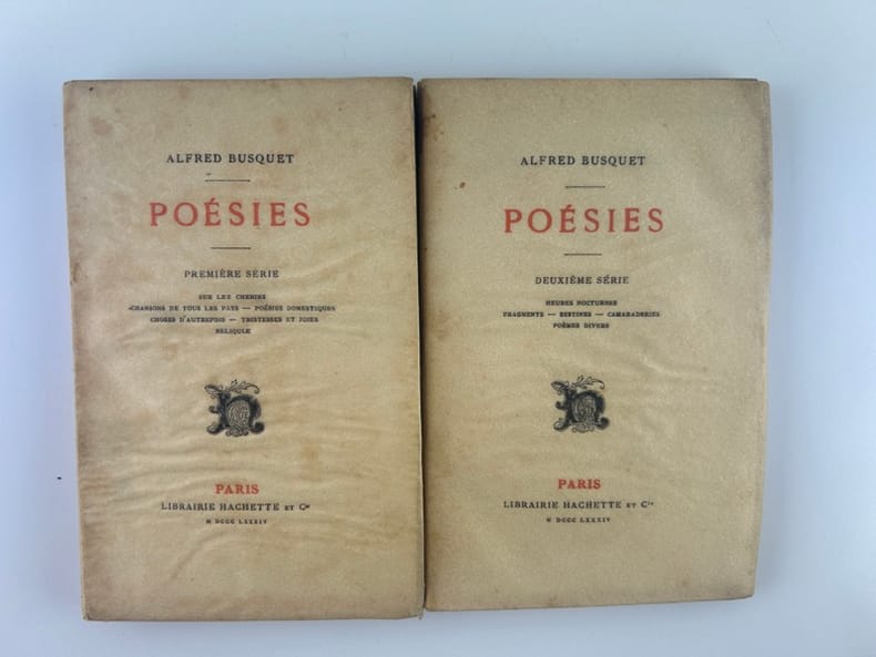 Paris Librairie Hachette 1884, 11x17,5cm, broché sous couverture rempliée imprimée, II, 171, 172p. Portrait de l'auteur en frontispice du premier tome. 1 ère série : Première série: Sur les chemins-chansons de tous les pays- Poésies domestiques - Choses d'autrefois- Tristesses et joies- Reliquiae. 2e série : Heures nocturnes- Fragments- Sestines- Camaraderies-Poèmes divers. Intérieur de toutes fraîcheur.