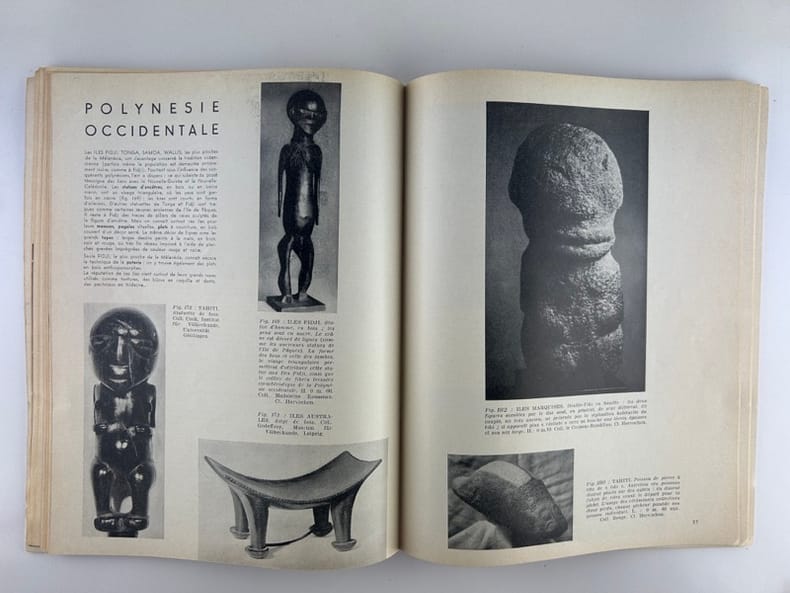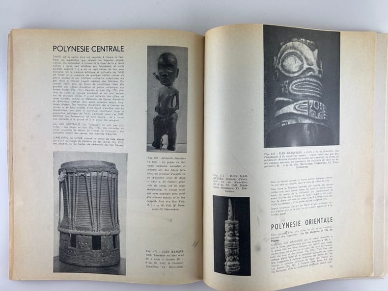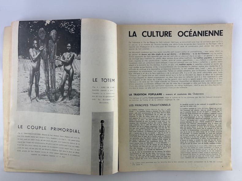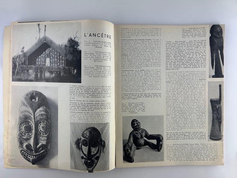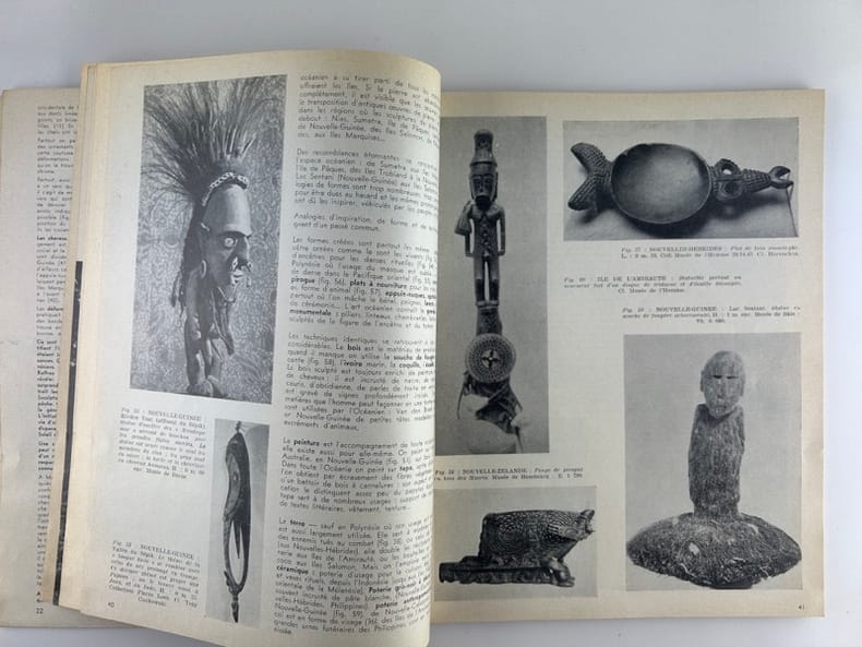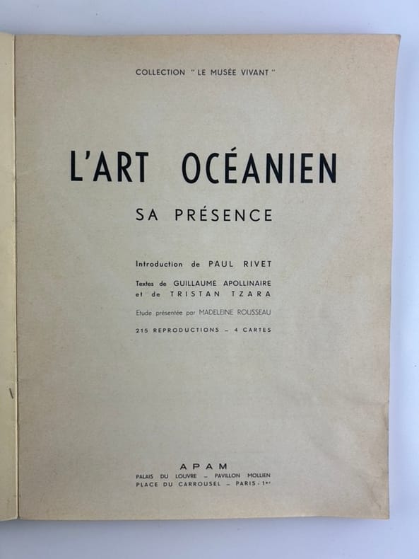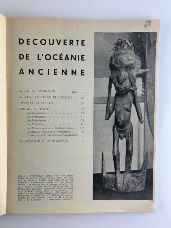 Paris A.P.A.M. Coll. Le Musée Vivant 1951, in-4, broché, 138p. Bon état. Couverture de Roger Falck. Sommaire : DECOUVERTE DE L'OCEANIE ANCIENNE : La culture océanienne La réalité historique de l'Océanie par Madeleine Rousseau - L'art des Océaniens : Les Australiens par Cotfte Burland . Les Indonésiens, Mélanésiens, Polynésiens, Micronésiens et le Pacifique nord . La sculpture religieuse à Madagascar par Jacques Faublée. Notice historique sur Madagascar par R. Carle. Les Océaniens et la navigation. L'art océanien et les collections L'évolution du goût vers l'art océanien Olivier Le Corneur Les collections des musées allemands par le Dr Kuntz Dittmer Les poètes découvrent l'art océanien A propos de l'art des Noirs (1917) Note sur l'art Nègre (1917) Note sur la poésie Nègre (1918) Deux poèmes australiens traduits en 1917 Guillaume Apollinaire et Tristan Tzara. L'art océanien entre les deux guerres par Patrick O' Reilly . Les artistes et l'art océanien par Madeleine Rousseau . L'OCCIDENT DEVANT L'OCEANIE : Découverte des Mers du Sud par Jean-Paul Faivre Le mythe du Pacifique dans la littérature, dans le cinéma par Simone Jacquemont et Pierre Guilbaud L'OCEANIE DEVANT L'OCCIDENT Madeleine Rousseau.